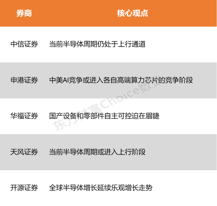 华福证券:国产设备和零部件自主可控迫在眉睫 近期,特朗普政府发布了《美国AI行动计划》,旨在通过放宽监管和扩大数据中心能源供应,来加速美国人工智能的发展。这一计划主要目的之一是让美国硬件和软件成为全球AI创新的“标准”平台。由此可以看出美国未来会进行更加严格的半导体设备和零部件出口管制,这将进一步推进国产设备和零部件自主可控的紧迫性,利好相关产业链。 天风证券:全球半导体增长延续乐观增长走势 2025年,全球半导体增长延续乐观增长走势,2025年AI驱下游增长。同时,政策对供应链中断与重构风险持续升级,二季度各环节公司业绩预告亮眼,展望三季度半导体旺季期,建议关注存储/功率/代工/ASIC/SoC业绩弹性。 开源证券:当前半导体周期或进入上行阶段 当前半导体周期或进入上行阶段,具备从“预期修复”走向“景气验证”的条件。相较上轮消费电子驱动,本轮叠加AI算力需求,景气斜率与需求上限有望提升。全球半导体行业正处于“成长加速期”的早中期阶段,AI需求成为本轮周期核心动能,GPU、HBM等高端芯片景气持续走高,PC、智能手机与汽车等传统终端温和修复。 (本文不构成任何投资建议,投资者据此操作,一切后果自负。市场有风险,投资需谨慎) (文章来源:东方财富研究中心) |