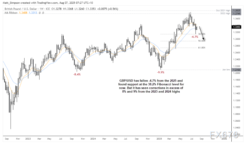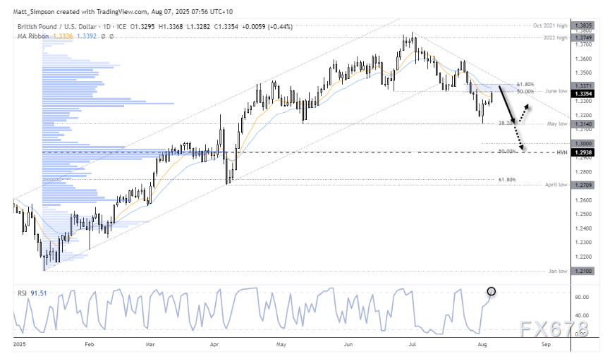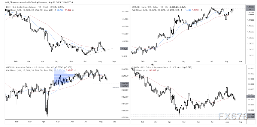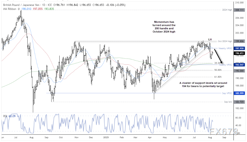 周四(8月7日)晚,北京时间19:00,英国央行将公布8月利率决议结果,市场普遍预期其将下调基准利率25个基点至4.0%,这将是自2024年8月以来的第五次降息,标志英国正式进入“宽松周期”。尽管降息大局已定,但货币政策委员会(MPC)内部陷入激烈分歧:此次决议的关键不仅在于降息幅度,更在于政策声明中的前瞻指引:若删除“渐进谨慎”表述或弱化通胀预期措辞,可能释放更强鸽派信号,进一步压制英镑汇率。 ![]() 英镑在英国央行(BOE)会议前出现反弹,主要受美元走软推动;但市场普遍预期英国央行将降息25个基点至4.0%,无论是投票分布还是前瞻指引,若会议释放鸽派信号,英镑兑美元与英镑兑日元的下行风险或进一步加剧。 与此同时,美元走低源于非农就业数据不及预期与ISM服务业数据疲软,叠加美国明尼阿波利斯联储主席尼尔·卡什卡里在CNBC的表态引发美联储降息猜测。尽管服务业通胀仍显顽固,但交易者正密切关注后续信号——当前两种英镑货币对均处于关键技术位附近,变盘或一触即发。 美元走弱态势延续,英国央行降息成英镑关键压制 周三(8月6日)美元普跌,美联储内部降息压力持续升温。卡什卡里关于降息的暗示因此前疲软的就业与服务业数据更具分量;尽管ISM数据服务价格上涨,但美联储成员对关税引发的通胀是否为暂时性存疑。随着经济数据走弱,支持降息与美元走弱的逻辑正不断强化。 从技术面看 美元指数、欧元兑美元、澳元兑美元及美元兑日元均显示美元存在偏空的动能:美元指数在98关口上方显弱,2日RSI小于10进入超卖区间;欧元兑美元逼近1.17关键位,突破或需美元指数跌破50日均线,在97.89附近,目前为潜在支撑; 澳元兑美元回升至0.65上方,但50日与20日均线叠加密集成交区的0.6513构成阻力; 美元兑日元在周二看涨的吞没K线组合的低点146.62上方暂稳,或存短暂反弹,但最终跌破146的概率更高。整体而言,英国央行会议前及美联储降息预期上升背景下,美元仍有进一步走弱空间。 ![]() 英国央行今日预计将利率下调25个基点至4%,隔夜指数掉期(OIS)市场已对此次降息进行完全定价,且价格隐含了鸽派倾向,1年期OIS显示未来12个月至少再降息25个基点。交易者需重点关注周四(8月7日)晚间的英国MPC会议的投票分布:若支持降息的票数增加,或暗示更多宽松将至,可能进一步压制英镑,尤其是叠加鸽派评论时。 此外,新西兰联储会议前,新西兰通胀预期值得关注:二季度劳动力成本上升0.6%(高于预期0.5%及前值0.4%),CPI同步上行;尽管失业率升至5.2%或支持降息,但持续通胀或迫使新西兰联储保持谨慎。 从英国央行政策预期与OIS定价看,左侧面板显示英国央行利率、核心CPI(年率3.7%)及MPC投票计数,指向降息25个基点至4.0%及进一步宽松信号;右侧面板英国SONIA OIS曲线显示1个月至1年期利率低于当前央行利率,确认市场对多次降息的预期——均支撑英镑兑美元因英国央行鸽派倾向承压的判断。 ![]() 英镑兑美元周线视角:英镑兑美元自7月高点下跌4.7%,其中半数跌幅发生在上周的看跌吞没K线形态期间。考虑到多数下跌倾向会以一共三浪的形式展开,当前跌幅(4.7%)相对较浅(2023年高点以来跌幅8.4%,2024年高点以来9.9%),未来数周或数月可能进一步下行。关键支撑位包括成交密集区的1.2938,以及4月低点与61.8%斐波那契回撤位(略高于1.2700)。 ![]() ![]() 英镑兑日元技术分析:动能转弱,下行指向194的关键位 英镑兑日元自4月184涨至7月近200(遇阻2024年10月高点)后,跌破上涨趋势线并且价格形成更低的肩部,看跌动能加速。当前价格处于回撤阶段,与英镑兑美元类似,日线或形成因动能惯性形成没有成交量的高点。 ![]() 北京时间15:42,英镑兑美元现报:1.3375/76 ![]() |