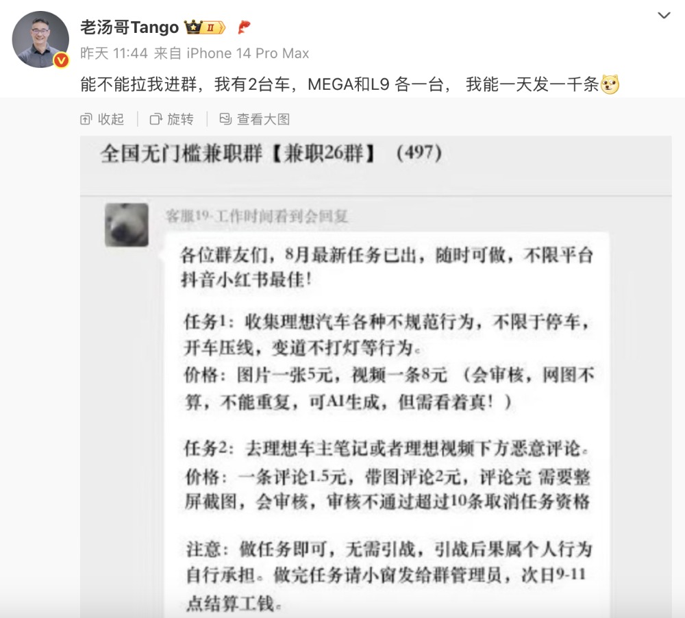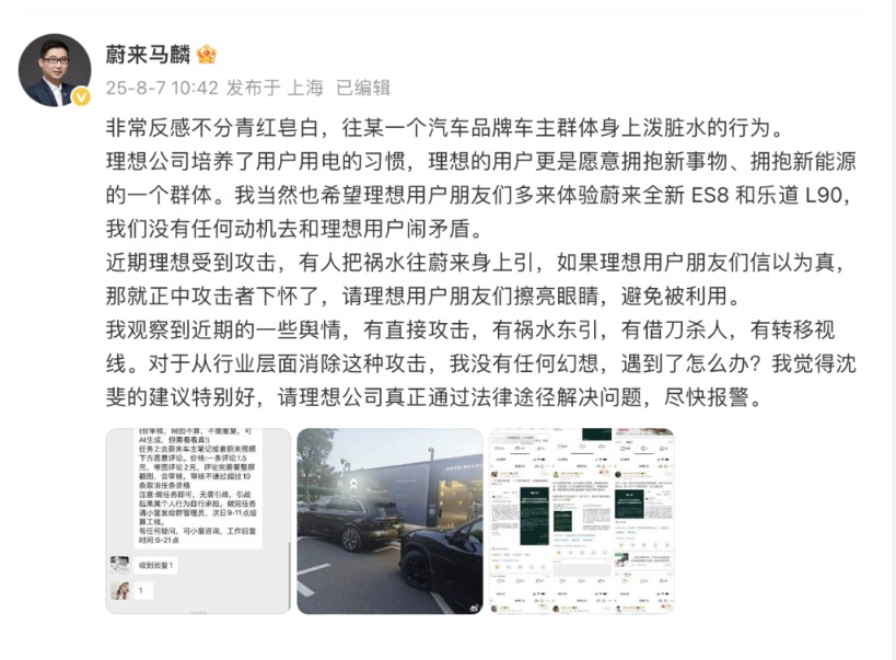 业内人士调侃,“黑水军”“黑公关”把法务部逼成了车企里最忙的部门。 8月7日,理想汽车法务部发文称,近日网络平台上出现针对理想车主的负面评价,致使车主们的生活受到严重侵扰。经核查,此类负面信息24小时不间断在多平台密集发布,具有多频次、内容高度同质化等特征,涉嫌有组织的违法犯罪。 理想汽车法务部表示,“警告背后黑手,我司正在固定相关证据,将坚决通过平台投诉、发起民事诉讼、刑事报案等一切法律途径追究其法律责任,维护广大用户和我司合法权益。” ![]() 就在一天前,理想汽车产品负责人汤靖晒出一张网络水军组织抹黑理想汽车的兼职群聊天截图,并调侃称,“能不能拉我进群,我有2台车,MEGA和L9各一台,我能一天发一千条。” 汤靖发布的截图显示,兼职人员主要有两个任务:一是收集理想汽车各种不规范行为,二是去理想车主笔记或者理想视频下方恶意评论。 ![]() 在理想发声后,网络上有不少声音称蔚来等企业是幕后黑手。 对此,蔚来品牌与传播助理副总裁马麟发文否认。 他写道,“非常反感不分青红皂白,往某一个汽车品牌车主群体身上泼脏水的行为。”“近期理想受到攻击,有人把祸水往蔚来身上引,如果理想用户朋友们信以为真,那就正中攻击者下怀了。” 他还提到“我觉得沈斐的建议特别好,请理想公司真正通过法律途径解决问题,尽快报警。” ![]() 马麟所提及的报警事件又牵扯到了数日前的“黑水军”风波。 7月24日,理想汽车副总裁刘杰在社交平台晒出截图,称有黑水军恶意抹黑理想i8。其发布的截图显示,有网友称试驾了理想i8和乐道L90,其评价明显捧高L90并贬低i8。对此,刘杰强调,i8还没有开始用户试驾,质疑该网友在抹黑理想。 随后,蔚来高级副总裁、乐道总裁沈斐留言建议其“直接报警”。 7月25日下午,沈斐再次发微博称,针对“报警事件”,网友已查实源头并非乐道,要求刘杰道歉。 ![]() 事实上,无论是蔚来还是理想,都曾是网络黑水军的严重受害者。 就在去年理想首款纯电车型MEGA上市时,其造型在网络上遭到恶意攻击,在很大程度上影响了2024年MEGA的市场表现。 蔚来CEO李斌也在媒体沟通会上直言,汽车行业水军泛滥,“每个月黑蔚来的水军费用大约有三五千万元”。为此,蔚来曾悬赏百万,公开征集黑公关和网络水军的线索。 当前,汽车行业的舆论环境正经历深刻变革,以敲诈勒索或是为车企诋毁竞品为目的的网络黑嘴大肆盛行。2023年起,多家车企陆续设立网络举报中心、开通法务部官方发布渠道,并悬赏数百万元以应对“黑公关”“黑水军”。 与此同时,国家层面也在加大管控力度,企业不再单打独斗。近年来,中央网信办持续部署开展“清朗”系列专项行动,集中时间与力量整治网上各类乱象,从严处置违规平台及账号。具体到汽车行业,去年中央网信办已公开通报多起自媒体侵权处理结果,如“蔡老板说车”“小牛说车”“车透社”等业内知名汽车自媒体账号均已被封号。