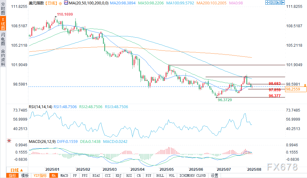 周四(8月7日)美盘时段,美元指数小幅走高,扭转早盘跌势。市场正在消化新的地缘政治新闻、海外央行政策变化,以及更多关于美国货币政策治理遭政治干预的迹象。美元曾短暂跌至1.5周低点97.927,盘中回升至98.26,当日上涨0.05%。 ![]() 欧元在盘中一度上涨至1.1688(7月28日以来的最高水平)后,回落0.17%至1.1638。此前,美俄官员旨在结束俄乌冲突的谈判引发乐观情绪,推动欧元上涨。尽管和平前景最初提振了欧元,但后续涨势有限,反映出市场对特朗普总统与普京总统谈判的时机和可信度存在不确定性。 英国央行降息,政策路径存分歧,英镑上涨 英国央行如预期宣布降息后,英镑上涨0.4%至1.3409。然而,九人组成的货币政策委员会(MPC)中有四人持反对意见,这加剧了市场的谨慎情绪。尽管英国央行坚持“渐进且谨慎”的指引,但分析师指出,持续的通胀和政治风险可能减缓英国的宽松步伐,支撑英镑对美元的短期韧性。 政治风险渐显,美联储降息预期升温 美国的政治动态继续影响美元情绪。在非农就业报告表现疲软后,特朗普总统解雇了一名高级劳工官员,且打算仅提名鸽派人士填补美联储即将出现的空缺,这引发了对美联储独立性的担忧。联邦基金期货目前显示,9月降息25个基点的概率为91%(一周前仅为48%),市场预计年底前累计降息约60个基点。 “对等”关税生效,美债收益率保持稳定 尽管特朗普推出的大规模新关税于周四生效,但美国国债收益率基本保持稳定。10年期国债收益率小幅降至4.225%,2年期国债收益率则升至3.722%。市场反应平淡,投资者认为这些贸易措施是出于政治动机,不太可能对短期经济状况造成重大干扰。 美元指数前景:阻力位下方或持续盘整 ![]() 美元指数仍被困在97.859的支撑位和98.683的阻力位之间,50日平均线(98.200)是关键支点。由于降息预期已被充分消化,且政治紧张局势加剧,该指数可能维持区间波动。除非后续数据或美联储的评论改变市场信心,否则美元有望在当前水平附近盘整。 北京时间00:57,美元指数报98.2530/699,涨幅0.05%。 ![]() |