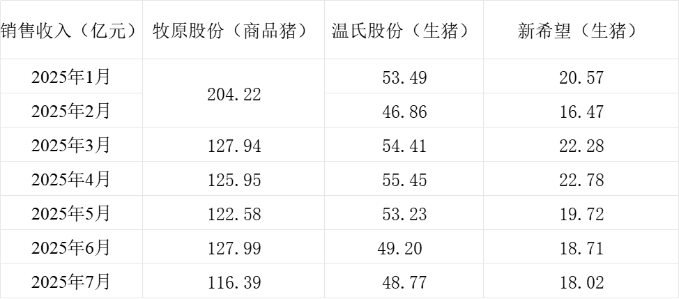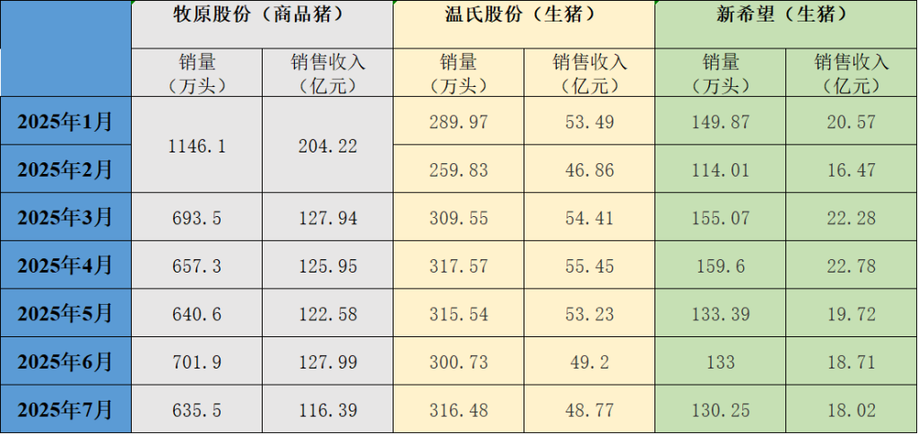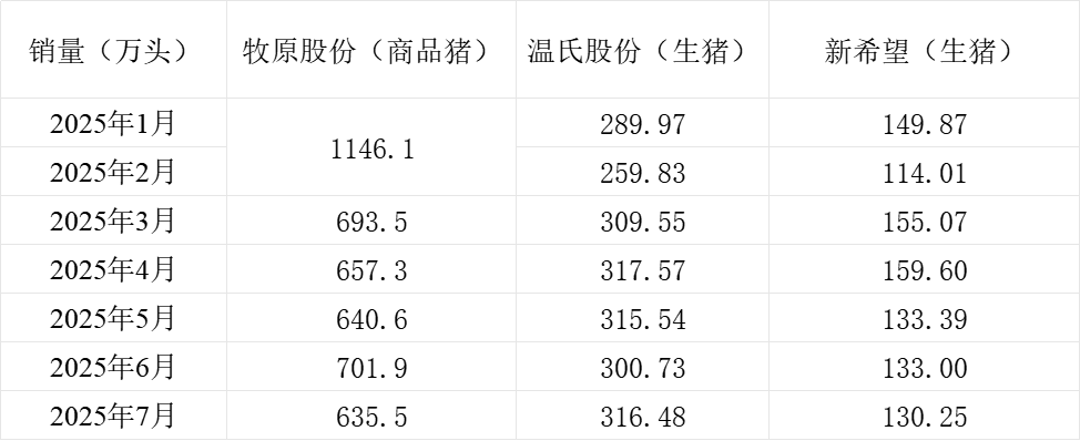 0三大上市猪企牧原股份(002714.SZ)、新希望(000876.SZ)、温氏股份(300498.SZ)近日发布2025年7月生猪销售情况简报。三大上市猪企2025年销售情况。制图澎湃新闻 从销量来看,环比方面牧原股份新希望环比下 ...