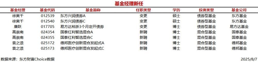 每经AI快讯,据东方财富Choice数据统计,今日新聘基金经理4人,涉及7只基金(A/C类分开计算),主要来自国泰基金、东方基金等公司。