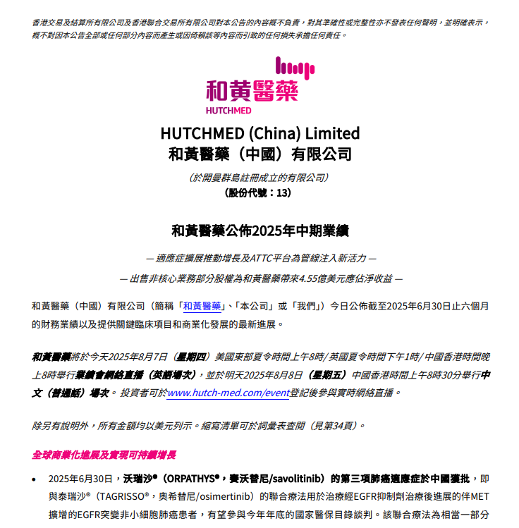 今日(8月8日)港股医药板块遭遇突发性抛售潮,多只医药股跌超10%。 有分析指出,港股医药股近期大跌是多重利空因素共振的结果,其中部分医药股中期业绩不及预期是直接导火索,特朗普政府对进口药品征收高额关税的政策,也引发了市场的担忧。 和黄医药公布业绩后股价大跌 8月8日,李嘉诚旗下医药公司——和黄医药的股价出现大跌,盘中最低跌至23.52港元,最大跌幅超16%。截至发稿,和黄医药的股价仍跌超15%。 8月7日晚,和黄医药发布2025年中期业绩,收入总额2.78亿美元,同比减少9.16%;净利润4.55亿美元,同比增加1663.32%,于2025年6月30日的现金余额为13.6亿美元,主要得益于出售一家非核心合资公司的部分股权后4.16亿美元的税后出售收益及出售款项。 ![]() 和黄医药非执行主席艾乐德博士(Dr Dan Eldar)表示,凭借稳健的财务状况、强劲的营运及令人期待的全新ATTC平台,和黄医药已为踏入新的增长时期做好准备。随着与中国生物科技公司的授权交易机会继续得到跨国制药公司的青睐,合作也依然是公司的战略重点之一。近几个月来,市场情绪和表现显著改善。中国本土的药品政策和定价环境也反映出对创新药开发的重点支持,商保创新药目录有望在今年晚些时候出台,为未来建立多元化、多层次的医疗社会保障支付体系奠定了基础。 和黄医药表示,公司已有13种肿瘤候选药物正处于各个临床试验阶段,其中四种药物(呋喹替尼、索凡替尼、赛沃替尼及他泽司他)已在中国内地获批。截至2025年7月,呋喹替尼已于包括美国、欧盟、日本在内的全球30多个国家获批或上市。赛沃替尼已于海外完成一项II期研究,并有一项III期研究正在进行中,若数据理想有望支持于全球提交新药上市申请。公司的第五种候选药物(索乐匹尼布)的中国新药上市申请已获国家药监局受理审评,有待批准。除上述候选药物之外,公司的新药发现及早期开发正专注于推进来自新一代ATTC技术平台的候选药物,目前已有多个分子处于临床前阶段。 业绩发布后,瑞银发表研究报告称,和黄医药中期收入按年跌9.2%至2.78亿美元,逊于该行预期。其中,肿瘤/免疫学收入为1.435亿美元,低于该行预期,净利润为4.55亿美元,主要是完成SHPL处置,低于该行预期。该行下调公司2025年至2027年收入预测,其H股目标价由37.7港元/股下调至36.9港元/股,维持“买入”评级。