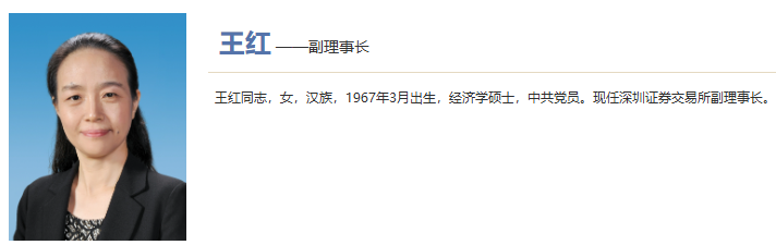 深圳证券交易所(下称“深交所”)迎新任副理事长。 8月8日,深交所官网资料显示,王红已履新深交所副理事长,不再担任上海证券交易所(下称“上交所”)党委委员、副总经理。 官网资料显示,王红,女,汉族,1967年3月出生,现年58岁,经济学硕士,中共党员。 ![]() 公开资料显示,王红1992年7月起在深交所工作,先后担任上市稽核部主任、武汉服务中心副主任、公司管理部副经理(主持工作)、公司管理部总监、会员管理部总监、中小板公司管理部总监、总经理助理。 2015年4月,王红出任深交所党委委员、副总经理。此后调去上交所,任上交所党委委员、副总经理。 截至记者发稿时,深交所官网“领导班子”一栏共显示9人资料,分别是:党委书记、理事长沙雁,党委副书记、总经理李继尊,副理事长王红;4位党委委员、副总经理,分别是李辉、李鸣钟、唐瑞、何才元;以及党委委员、纪委书记余支政,总工程师喻华丽。 官网资料显示,深交所于1990年12月1日开始营业,是经国务院批准设立的全国性证券交易场所,受中国证监会监督管理。深交所依照《证券法》《证券交易所管理办法》和《深圳证券交易所章程》规定,履行市场组织、市场监管和市场服务等职责,主要包括提供证券集中交易的场所、设施和服务,依法审核证券发行上市申请,组织和监督证券交易,对会员、上市公司及其他信息披露义务人进行监管,开展投资者教育和保护等。 深交所是实行自律管理的会员制法人,现有122家会员和2家特别会员,在所党委领导下,建立了会员大会、理事会、经理层、监事会“三会一层”的治理结构。 深交所官网8月8日数据显示,目前深交所股票总市值37.54万亿元,股票流通市值32.26万亿元,上市公司数为2874家。