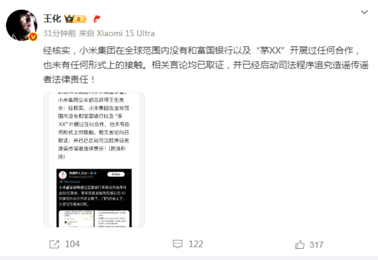 8月8日,针对网传“雷军通过富国银行茅XX向海外转出50亿美金”,小米集团公关部总经理王化发文辟谣称,经核实,小米集团在全球范围内没有和富国银行以及“茅XX”开展过任何合作,也未有任何形式上的接触。相关言论均已取证,并已经启动司法程序追究造谣传谣者法律责任。 ![]()