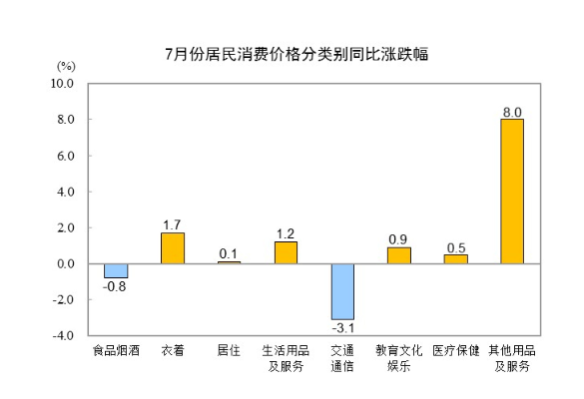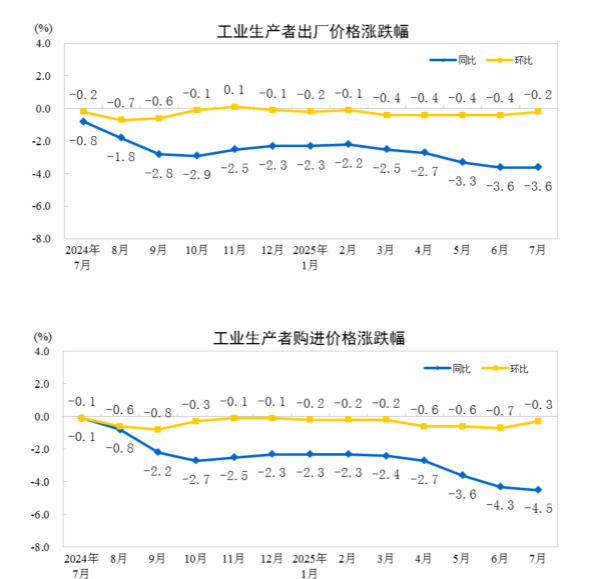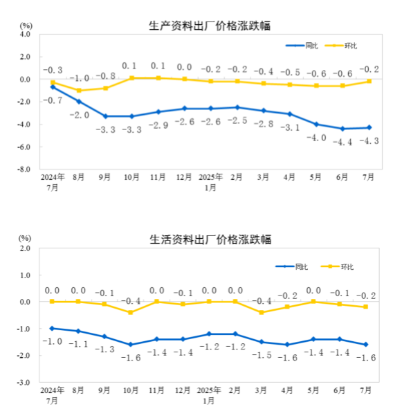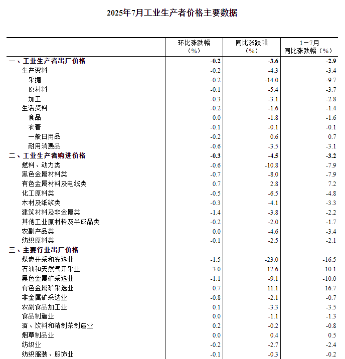 2025年7月份居民消费价格同比持平 2025年7月份,全国居民消费价格同比持平。其中,城市持平,农村下降0.3%;食品价格下降1.6%,非食品价格上涨0.3%;消费品价格下降0.4%,服务价格上涨0.5%。1—7月平均,全国居民消费价格比上年同期下降0.1%。 7月份,全国居民消费价格环比上涨0.4%。其中,城市上涨0.4%,农村上涨0.3%;食品价格下降0.2%,非食品价格上涨0.5%;消费品价格上涨0.2%,服务价格上涨0.6%。 ![]() 一、各类商品及服务价格同比变动情况 7月份,食品烟酒类价格同比下降0.8%,影响CPI(居民消费价格指数)下降约0.21个百分点。食品中,蛋类价格下降11.2%,影响CPI下降约0.07个百分点;鲜菜价格下降7.6%,影响CPI下降约0.16个百分点;畜肉类价格下降4.6%,影响CPI下降约0.14个百分点,其中猪肉价格下降9.5%,影响CPI下降约0.13个百分点;粮食价格下降1.0%,影响CPI下降约0.02个百分点;水产品价格上涨3.4%,影响CPI上涨约0.07个百分点;鲜果价格上涨2.8%,影响CPI上涨约0.06个百分点。 其他七大类价格同比六涨一降。其中,其他用品及服务、衣着、生活用品及服务价格分别上涨8.0%、1.7%和1.2%,教育文化娱乐、医疗保健、居住价格分别上涨0.9%、0.5%和0.1%;交通通信价格下降3.1%。 ![]() 二、各类商品及服务价格环比变动情况 7月份,食品烟酒类价格环比下降0.1%,影响CPI下降约0.04个百分点。食品中,鲜果价格下降3.4%,影响CPI下降约0.07个百分点;鲜菜价格上涨1.3%,影响CPI上涨约0.03个百分点;畜肉类价格上涨0.4%,影响CPI上涨约0.01个百分点,其中猪肉价格上涨0.9%,影响CPI上涨约0.01个百分点;水产品价格上涨0.4%,影响CPI上涨约0.01个百分点。 其他七大类价格环比六涨一降。其中,交通通信、教育文化娱乐、其他用品及服务价格分别上涨1.5%、1.3%和0.9%,生活用品及服务、医疗保健、居住价格分别上涨0.8%、0.2%和0.1%;衣着价格下降0.3%。 ![]() ![]() ![]() 附注 1.指标解释 居民消费价格指数(Consumer Price Index,简称CPI)是度量居民生活消费品和服务价格水平随着时间变动的相对数,综合反映居民购买的生活消费品和服务价格水平的变动情况。 2.统计范围 居民消费价格统计调查涵盖全国城乡居民生活消费的食品烟酒、衣着、居住、生活用品及服务、交通通信、教育文化娱乐、医疗保健、其他用品及服务等8大类、268个基本分类的商品与服务价格。 3.调查方法 采用抽样调查方法抽选确定调查网点,按照“定人、定点、定时”的原则,直接派人到调查网点或从互联网采集原始价格。数据来源于全国31个省(区、市)约500个市县、10万余家价格调查点,包括商场(店)、超市、农贸(生鲜)市场、服务网点和互联网电商等。 4.数据说明 由于“四舍五入”原因,有时会出现合计数据与分类数据高值或低值相同的情况。 2025年7月份工业生产者出厂价格环比降幅收窄 2025年7月份,全国工业生产者出厂价格环比下降0.2%,工业生产者购进价格环比下降0.3%,降幅比上月分别收窄0.2个和0.4个百分点。工业生产者出厂价格同比下降3.6%,工业生产者购进价格同比下降4.5%。1—7月平均,工业生产者出厂价格比上年同期下降2.9%,工业生产者购进价格下降3.2%。 ![]() 一、工业生产者价格同比变动情况 7月份,工业生产者出厂价格中,生产资料价格下降4.3%,影响工业生产者出厂价格总水平下降约3.20个百分点。其中,采掘工业价格下降14.0%,原材料工业价格下降5.4%,加工工业价格下降3.1%。生活资料价格下降1.6%,影响工业生产者出厂价格总水平下降约0.42个百分点。其中,食品价格下降1.8%,衣着价格下降0.1%,一般日用品价格上涨0.6%,耐用消费品价格下降3.5%。 ![]() 工业生产者购进价格中,燃料动力类价格下降10.8%,黑色金属材料类价格下降8.0%,化工原料类价格下降6.5%,农副产品类价格下降4.6%,建筑材料及非金属类价格下降3.8%,纺织原料类价格下降2.5%;有色金属材料及电线类价格上涨2.8%。 二、工业生产者价格环比变动情况 7月份,工业生产者出厂价格中,生产资料价格下降0.2%,影响工业生产者出厂价格总水平下降约0.17个百分点。其中,采掘工业价格下降0.2%,原材料工业价格下降0.1%,加工工业价格下降0.3%。生活资料价格下降0.2%,影响工业生产者出厂价格总水平下降约0.06个百分点。其中,食品价格持平,衣着价格下降0.1%,一般日用品价格下降0.2%,耐用消费品价格下降0.6%。 工业生产者购进价格中,建筑材料及非金属类价格下降1.4%,黑色金属材料类价格下降0.7%,燃料动力类价格下降0.6%,化工原料类价格下降0.5%,纺织原料类价格下降0.1%;农副产品类价格持平;有色金属材料及电线类价格上涨0.7%。 ![]() ![]() 附注 1.指标解释 工业生产者价格指数包括工业生产者出厂价格指数(Producer Price Index for Industrial Products,简称PPI)和工业生产者购进价格指数。 工业生产者出厂价格指数反映工业企业产品第一次出售时的出厂价格的变化趋势和变动幅度。 工业生产者购进价格指数反映工业企业作为中间投入产品的购进价格的变化趋势和变动幅度。 2.统计范围 工业生产者出厂价格统计调查涵盖40个工业行业大类、1300多个基本分类的工业产品价格;工业生产者购进价格统计调查涵盖9大类、800多个基本分类的工业产品价格。 3.调查方法 工业生产者价格调查采取重点调查与典型调查相结合的调查方法,涉及全国4万多家工业企业。 4.统计标准 工业行业划分标准的依据是《国民经济行业分类》(GB/T4754-2017)。 5.数据说明 由