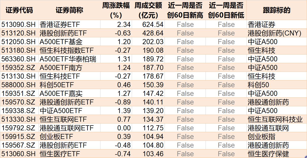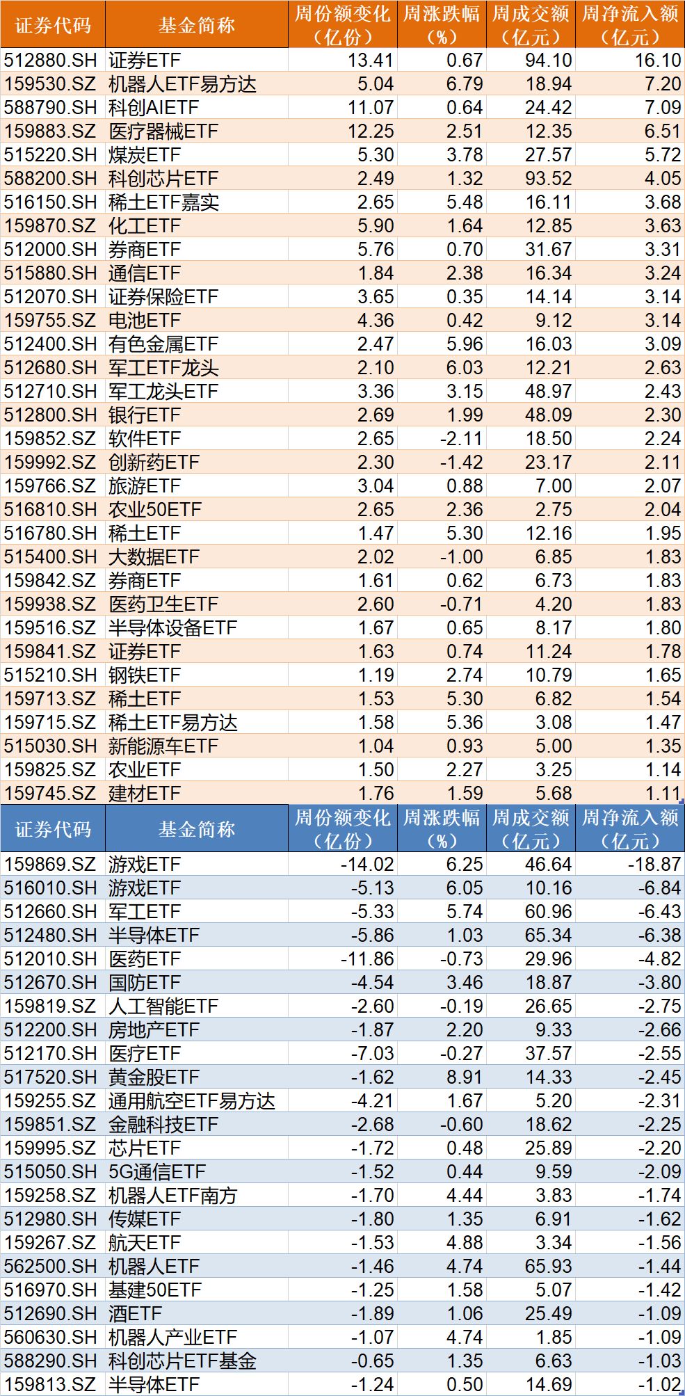 每经记者|叶峰 每经编辑|赵云 本周股指集体上涨,沪深两市股票型ETF和跨境型ETF合计净流出约百亿元。 从行业主题ETF上看,证券、机器人、人工智能等ETF被资金看好,而游戏、军工相关ETF被资金抛售。 约百亿元资金借道ETF离场 本周沪深两市成交8.37万亿元,其中沪市成交3.47万亿元,深市成交4.9万亿元。截至最新收盘,沪指报收于3635.13点,全周上涨2.11%,深证成指报收于11128.67点,全周上涨1.25%。 本周主要指数相关ETF表现 本周市场主要股指集体上涨,规模较大的ETF中,中证1000ETF涨超2%。 Wind数据显示,上述10只指数ETF本周合计净流出71.65亿元,其中上证50ETF净流出22.37亿元。 总体而言,本周沪深两市股票型ETF和跨境型ETF合计净流出约百亿元。 有券商表示,当前大盘整体趋势仍偏强势,近期两融余额重返两万亿大关,显示市场信心不断回升。不过,当前上证指数点位处于前期高位附近,市场上方或存在一定抛压,需要注意高位的震荡反复。中期在资金面支撑与基本面修复的背景下,预计A股市场向好趋势不改,后续指数中枢或将逐级抬升。 证券、机器人、人工智能等ETF净流入资金居前 在行业主题ETF方面,本周净流入资金超1亿元的基金有32只,其中证券ETF、机器人ETF易方达和科创AIETF分别增加了13.41亿份、5.04亿份和11.07亿份,净流入资金分别为16.1亿元、7.2亿元和7.09亿元。 在资金流出方面,本周有23只行业主题ETF净流出逾1亿元,其中游戏ETF(159869)、游戏ETF(516010)和军工ETF份额分别减少14.02亿份、5.13亿份和5.33亿份,分别净流出资金18.87亿元、6.84亿元和6.43亿元。 值得注意的是,机器人、AI相关ETF本周获资金大幅买入,基金份额均创近一年新高。 机器人ETF易方达(159530)市场走势及份额变化 有券商表示,从人形机器人量产节奏的角度,2025年将会是突破性的一年。万台级别的量产将带动下游产业链进入确定性放量阶段,而万台级别的数据采集和训练有望真正解决数据匮乏的难题,推动人形机器人向更泛化、更实用的阶段发展。 科创AIETF(588790)市场走势及份额变化 有券商表示,展望2025年下半年,科技产业的投资主线将继续围绕AI展开。随着大模型的持续进步以及中国科技公司在生态、场景落地等方面的探索,AI正在从单点的技术进步迈向更广泛的生产力落地阶段。AI带来的产品形态、生产效率的改善已在广告、游戏、管理软件、智能汽车等领域改变了具体的产品形态或行业格局,为行业创造新的价值。推荐投资人持续关注AI生态扩张、应用落地为细分行业所带来的投资机会。 香港证券ETF周成交额超600亿元 本周,股票型ETF和跨境型ETF中成交额超100亿元的ETF有16只。 其中,香港证券ETF周成交额超600亿元,港股创新药ETF周成交额超400亿元。 有机构认为,基于良好的半年度业绩预告,叠加资本市场改革深化、流动性宽松及市场指数中枢上移预期,券商板块下半年投资机遇凸显。 4只ETF下周上市 基金重仓股向来是投资者关注的热点。但是,主动管理型基金的重仓股浮出水面,通常都有一定的滞后性,而ETF布局的标的却是非常明确的,通过跟踪新上市ETF,通常可以发现近期热点个股,新上市ETF带来的增量资金也值得关注。 目前有4只ETF披露下周上市,跟踪标的为恒生指数、科创板50、机器人产业和中证A50增强。 目前有6只ETF披露下周发行,跟踪标的有科创200、科创综合、A500红利低波动、港股通创新药、通用航空等。 封面图片来源:每日经济新闻 |