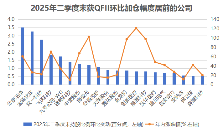 2025年半年报披露拉开序幕,上市公司的机构持股动向浮出水面,备受关注的合格境外机构投资者(QFII)持股曝光。 44家公司获QFII持股 据证券时报·数据宝统计,截至2025年8月8日晚10点,已披露2025年半年报的170余家公司中,44家公司获QFII持股(包含除半年报以外的公告披露的前十大股东信息)。 截至2025年6月30日,这44家公司QFII持股数量合计超过2.7亿股,环比增加超26万股;持股市值接近48亿元,环比增加超过7亿元。 从单家公司来看,截至2025年6月30日,QFII持股市值超过5000万元的公司有13家,持股市值超过1亿元的公司有7家,包括九号公司-WD、东方雨虹、海大集团、宏发股份等。 九号公司-WD获QFII持股市值暂居首位,为11.69亿元,公司前十大流通股东名单中出现2家QFII身影,分别为阿布达比投资局、施罗德环球基金系列中国A股(交易所),持股市值环比增加超过5亿元。财报显示,公司2025年上半年实现营业收入117.42亿元,同比增长76.14%,实现净利润12.42亿元,同比增长108.45%。上半年营收及净利润均创下2019年以来同期最高水平。从营收构成来看,公司电动车系列产品收入翻倍,营收占比超过58%,公司计划明年在欧洲市场发布E-Bike相关产品。 对东方雨虹而言,QFII可以称得上是其“忠实粉丝”。自2020年一季度至2025年二季度,QFII对东方雨虹的持股周期长达22个季度。截至2025年6月30日,东方雨虹获QFII持股市值超10亿元,前十大流通股东名单中出现科威特政府投资局、阿布达比投资局等QFII身影。 海大集团获QFII持股超过5亿元,环比下降。公司上半年实现营业收入588.31亿元,同比增长12.5%;实现净利润26.39亿元,同比增长24.16%,增速较去年同期下滑。公司表示,受累于上半年禽肉价格低迷,公司探索性布局的禽养殖、屠宰相关业务录得亏损。 ![]() 20家公司环比 获QFII加仓超0.5个百分点 从持股比例变动来看,与一季度末比,截至2025年二季度末,获QFII持股的公司中,有29家获QFII加仓(含新进持股公司),加仓超0.5个百分点的公司有20家,加仓超1个百分点的公司有9家,加仓比例居前的有华康洁净、金浦钛业、飞沃科技等。 华康洁净获3家QFII公司新进持股,持股比例合计3.51%,分别为巴克莱银行有限公司(简称“巴克莱银行”)、摩根大通证券有限公司、高盛集团(The Goldman Sachs Group, Inc.),其中巴克莱银行新进成为公司第四大流通股东,公司2025年上半年营业收入增幅超过50%,净利润同比扭亏为盈。根据半年报,公司营业收入主要来自于净化系统集成业务和医疗耗材销售,本报告期顺利交付项目共计22个,截至报告期末,公司在手订单38.27亿元,主要为净化集成业务订单,其中医疗专项订单25.37亿元、实验室订单7.74亿元、电子洁净订单1.21亿元,彰显“医疗专项—实验室-电子洁净”三足鼎立格局。 金浦钛业在7月15日发布的《重大资产置换、发行股份及支付现金购买资产并募集配套资金暨关联交易预案》中,披露了最新前十大流通股东信息。数据显示,截至2025年6月30日,公司获5家QFII新进持股,持股比例合计3.27%,包括巴克莱银行、瑞士联合银行集团、摩根大通证券有限公司等。 另外,双一科技、飞沃科技、九号公司-WD、路畅科技获QFII加仓均不低于1.4个百分点,其中飞沃科技获摩根大通证券有限公司、巴克莱银行有限公司新进持股,一季度持股机构摩根士丹利国际股份有限公司在今年二季度退出前十大流通股东名单。 从市场表现来看,截至8月8日,获QFII加仓超过0.5个百分点的20家公司年内平均涨幅接近48%,创新医疗、南极光、鼎通科技涨幅领先,前2家公司股价翻倍;鼎通科技涨幅接近100%,公司获QFII新进持股的同时,今年二季度还获得社保基金加仓,公司2025年上半年净利润增幅超过130%,大幅超越去年同期。对于业绩的大增,公司表示,报告期内公司在手订单充足,同时受益于海内外基础设施投入加大,通信产品需求旺盛等因素所致。 ![]() 3家QFII新进持股公司 账面浮盈超4500万元 从上文分析不难看出,巴克莱银行、阿布达比投资局等QFII机构今年二季度以来动作较为频繁。截至8月8日,巴克莱银行持有的A股公司多达20家,除上文提及公司外,还有辉煌科技、通达股份、金河生物等均为巴克莱银行今年二季度新进持股公司。 另外,瑞士联合银行集团二季度新进持股公司多达12家,大小摩(摩根士丹利国际股份有限公司、摩根大通证券有限公司)新进持股公司分别为7家、10家。 持股收益如何?以截至今年二季度获QFII新进持股的公司为样本(为保证估算有效性,取2024年三季度至2025年一季度均未获QFII持股的样本),对比最新收盘价与今年二季度的平均成交价,以持股数量*(最新收盘价减二季度成交均价)测算持股收益。结果显示,瑞士联合银行集团、巴克莱银行、摩根士丹利国际股份有限公司3家机构账面浮盈均超过4900万元。 瑞士联合银行集团新进持股的收益位居首位,账面浮盈超8100万元,其二季度新进持股的上纬新材最新收盘价较二季度成交均价涨幅超过10倍,瑞士联合银行集团二季度新进持股69.81万股,持股收益超过5500万元;另外,该机构新进持有的沃华医药、金浦钛业等公司持股收益均超过百万元。 ![]()