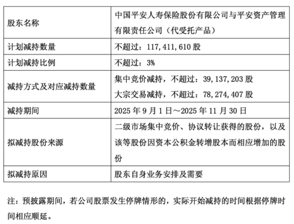 8月8日,华夏幸福基业股份有限公司(600340.SH)公告持股5%以上股东减持股份计划。 公告显示,近日,华夏幸福收到平安资产管理有限责任公司致送的《持股5%以上股东股份减持计划告知函》,中国平安人寿保险股份有限公司及其一致行动人平安资管计划自本公告披露之日起15个交易日后的3个月内,即9月1日-11月30日,拟减持所持股份不超过1.1741161亿股,占公司总股本比例不超过3%。其中,拟通过大宗交易方式进行减持的,在任意连续90日内减持股份数量不超过公司总股本的2%,即不超过7827.4407万股;拟通过集中竞价交易方式进行减持的,在任意连续90日内减持股份数量不超过公司总股本的1%,即不超过3913.7203万股。若减持计划期间华夏幸福有送股、资本公积金转增股本、配股、回购注销等股份变动事项的,上述减持股份数量将相应调整。拟减持股份的价格区间视市场价格确定。 ![]() 平安人寿和平安资管为华夏幸福第一大股东。目前,平安人寿持有华夏幸福股份9.84079977亿股,占公司目前总股本39.13720342亿股的25.1444%。平安人寿及其一致行动人平安资管合计持有公司股份9.85729553亿股,占公司目前总股本的25.1865%。其中,协议转让取得7.53010502亿股,集中竞价交易取得524.3001万股,资本公积金转增股本取得2.2747605亿股。 公告称,本次减持计划系平安人寿及其一致行动人平安资管根据自身业务安排及需要进行的减持。减持期间,减持主体将根据市场情况、公司股价情况等情形决定是否实施及如何实施本次股份减持计划,本次减持的时间和价格等存在不确定性,敬请各位投资者注意投资风险。 此前,华夏幸福预计2025年半年度将实现归属于上市公司股东的净利润为-75亿元到-55亿元;预计公司2025年半年度将实现归属于上市公司股东的扣除非经常性损益的净利润为-83亿元到-63亿元。去年同期,华夏幸福利润总额为-63.86亿元;归属于上市公司股东的净利润为-48.49亿元;归属于上市公司股东的扣除非经常性损益的净利润为-63.13亿元。 华夏幸福对于业绩预亏的主要原因表示,受其房地产项目结转节奏等因素影响,公司上半年房地产结转项目较少,公司结转收入下降,从而导致了净利润下降。随着公司债务重组工作的持续推进,整体资金成本维持在较低水平,但债务存量金额仍然较大,且随着房地产存量项目竣备、交付、结转,可承载利息资本化的项目载体量小,当期利息资本化率极低,从而财务费用仍处于高位。该公司将持续推进《债务重组计划》,推动金融债务重组协议签订等各项工作,以进一步减轻公司财务费用压力。坚决完成“保交楼”要务,持续推进债务重组,聚焦业务开展,坚持提质增效,坚定“全面转型产业新城服务商”战略方向,加快推动公司转型发展。 截至8月8日,华夏幸福收于2.18元,跌幅0.91%,总市值约85亿元。