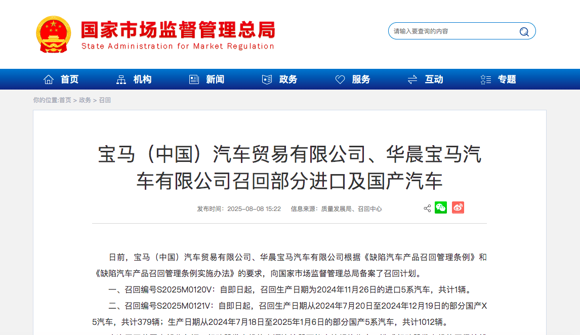 图片来源:国家市场监督管理总局网站 自即日起,召回生产日期为2024年11月26日的进口5系汽车,共计1辆。同时,自即日起召回生产日期从2024年7月20日至2024年12月19日的部分国产X5汽车,共计379辆;生产日期从2024年7月18日至2025年1月6日的部分国产5系汽车,共计1012辆。 关于召回原因,系召回范围内部分车辆,起动器发电机的电源连接器可能未按规格生产,造成起动器发电机的正极接线柱与48V线束的正极端子之间连接松动,电阻异常增大。极端情况下,可能导致车辆行驶中熄火或发动机舱烧蚀起火,存在安全隐患。 对此,宝马(中国)、华晨宝马将为召回范围内的车辆免费检查起动器发电机,必要时进行更换;检查相关电缆,必要时进行维修或更换,以消除安全隐患。 据了解,本次召回为2025年5月9日发布的《宝马(中国)汽车贸易有限公司、华晨宝马汽车有限公司召回部分进口及国产汽车》召回活动的扩大召回。 彼时,宝马(中国)、华晨宝马召回生产日期从2020年12月2日至2023年12月12日的部分进口i4汽车、生产日期从2023年8月2日至2023年12月13日的部分进口i5汽车、生产日期从2021年9月13日至2024年1月11日的部分进口i7系汽车等共计22.91万辆汽车。当时召回范围内的车辆,是由于绝缘故障的监测机制问题,在特定工况下,车辆高压系统可能出现误关闭的情况,造成电气驱动单元失去动力,增加车辆发生碰撞的风险,存在安全隐患。对此,宝马(中国)、华晨宝马为召回范围内的车辆免费进行软件升级,以消除安全隐患。 加上今年8月的这次召回,宝马(中国)、华晨宝马两次共计召回车辆超23万辆。 每日经济新闻 (责任编辑:董萍萍 )