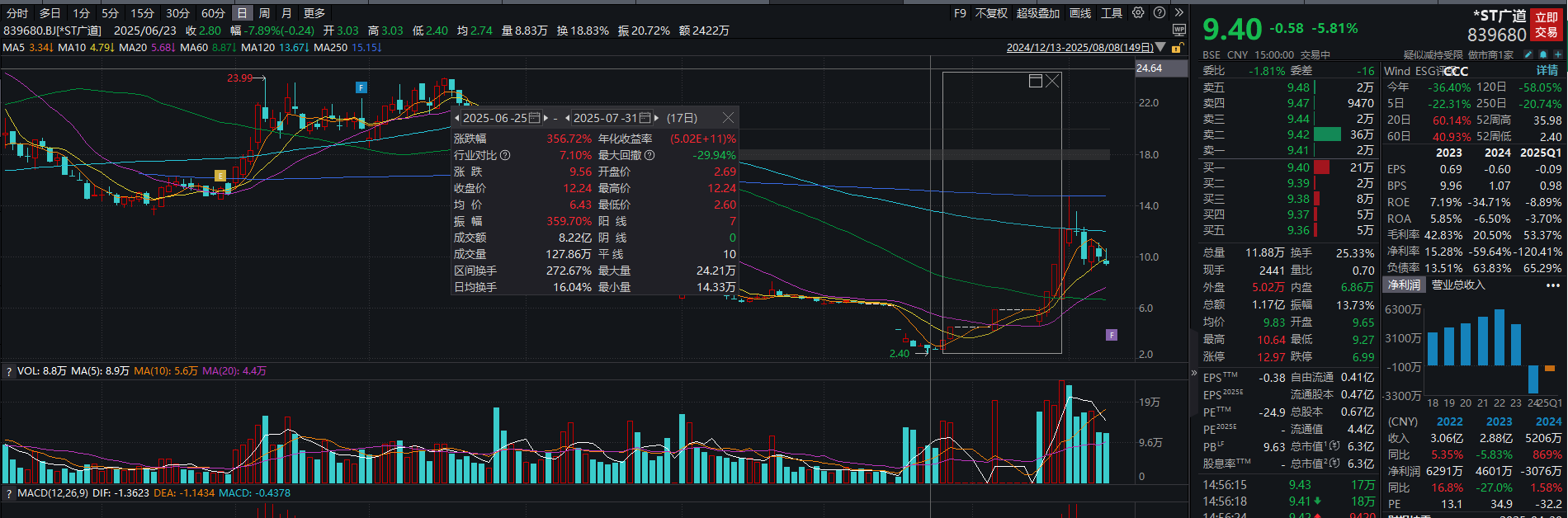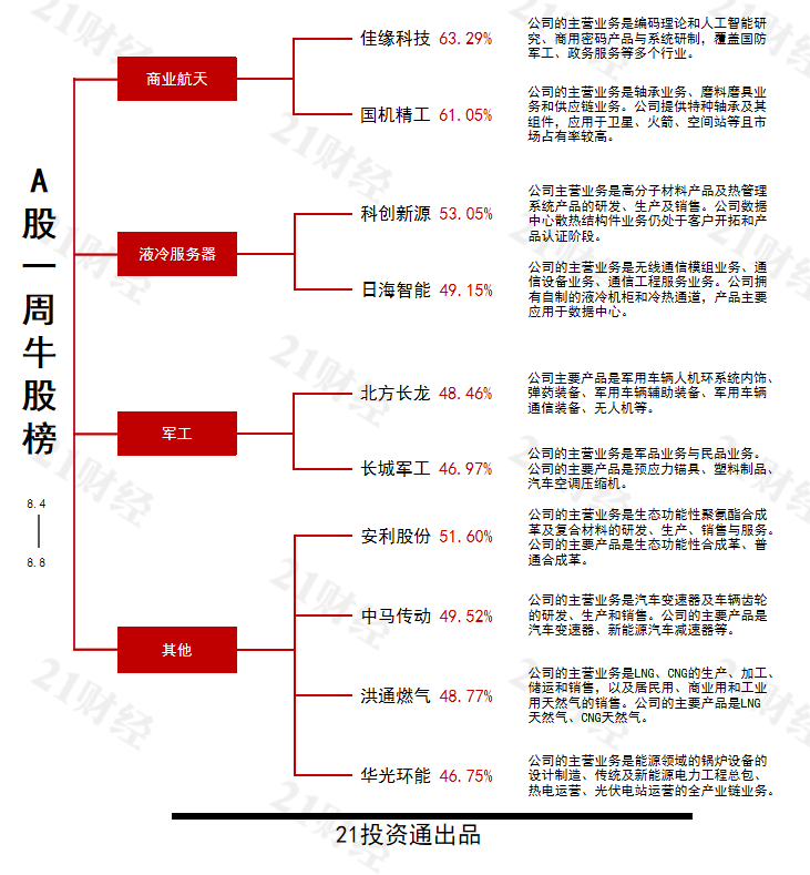 商业航天催化不断,最牛股佳缘科技周涨超63% 本期牛股榜中,佳缘科技(301117.SZ)以63.29%的周涨幅夺魁,国机精工(002046.SZ)以61.05%的涨幅位居第二,科创新源(300731.SZ)、安利股份(300218.SZ)、中马传动(603767.SH)、日海智能(002313.SZ)周涨幅超49%。本期牛股榜十只个股过去一周累计涨幅均超过46%。 最牛股佳缘科技属于国防军工板块,商业航天概念股: 二级市场方面,过去一周(8月4日—8月8日),受商业航天利好消息影响,公司股价持续走高,截至8月8日收盘,公司本周涨幅达61.05%,每股价格报41.15元,总市值为53亿元。 ![]() 公开资料显示,公司的主营业务是编码理论和人工智能研究、商用密码产品与系统研制。公司的主要产品是编码和人工智能研究、商用密码产品与系统、航空、航天和地面安全终端专用计算平台设计开发、医疗健康信息化综合解决方案、国防军工信息化综合解决方案、政务服务信息化综合解决方案、档案数字化服务、运维服务及设计服务。 消息面上,本周商业航天板块催化不断,卫星发射频率显著提升。 据海南省人民政府网站,8月4日,海南印发《海南省加快构建具有特色和优势现代化产业体系三年行动方案(2025-2027年)》。其中提到,加快培育商业航天全产业链。着力培育文昌国际航天城航天产业集群,建设航天重大科创基地,壮大火箭链、卫星链、数据链。推动商业航天发射场核心能力提升,加快商业航天发射场二期和配套设施建设。推进卫星超级工厂建设,开工建设卫星部组件制造中心、火箭大部段制造中心等项目,积极引进商业航天企业布局总装总测能力,推动星、箭、场一体化发展。 据央视新闻,8月4日,我国在海南商业航天发射场使用长征十二号运载火箭,成功将卫星互联网低轨07组卫星发射升空。卫星顺利进入预定轨道,发射任务获得圆满成功。此次发射在海南商业航天发射场的二号发射工位进行,而在7月30日,海南商业航天发射场一号工位刚刚完成了长征八号甲运载火箭的发射任务。短期内实现双工位连续发射,这也进一步验证了海南商业航天发射场的高密度发射能力。 据证券时报,本周末(8月9日—8月11日),捷龙三号遥六运载火箭将搭载时空道宇公司“吉利星座04组”11颗卫星升空,择机在日照近海发射,瞄准前沿时间8月9日凌晨0时33分。本次发射的“吉利星座04组”11颗卫星,主要为吉利旗下极氪、领克等品牌提供厘米级高精定位、卫星通信及自动驾驶支持。 中信建投表示,2025年7月底以来,我国GW星座发射频率显著提升,从01-05组星的一到两个月发射间隔缩短到05-07组星的3-5天发射间隔,组网速度明显加快,或表明我国卫星互联网开始进入快速组网期。此外,千帆星座的发射招标也已经启动,海南商发的1号和2号发射工位开启常态化发射工作,大型民营液体火箭也将陆续首飞,可重复使用实验稳步开展,民营火箭企业开始IPO辅导,我国商业航天产业进入快速发展期。 东吴证券日前在研报中指出,卫星互联网已成为全球争抢的热点,公司目前为通信安全赛道重要企业,考虑到未来卫星量产及设备替换,有望深度受益于低轨卫星放量,且未来卫星、飞机还有舰上都需要信息互联,为公司业绩增长带来更大动能。 值得一提的是,8月6日,佳缘科技公告称,公司股票交易价格连续三个交易日收盘价格涨幅偏离值累计达到39.10%,属于股票交易异常波动情形。经核实,公司前期披露的信息不存在需要更正、补充之处,公司目前的经营情况正常,近期公司经营情况及内外部经营环境未发生重大变化,公司控股股东和实际控制人不存在关于公司的应披露而未披露的重大事项,也不存在处于筹划阶段的重大事项。 ![]() 7日大涨356%三度停牌核查,最熊股*ST广道本周跌超22% 剔除最近两周上市的次新股,本期十大熊股中,*ST广道(839680.BJ)以22.31%的跌幅成为本期的最熊股。华蓝集团(301027.SZ)以22.18%的周跌幅紧随其后,天府文旅(000558.SZ) 安正时尚(603839.SH) 茂业商业(600828.SH) 南新制药(688189.SH)等股的周跌幅均在18.5%以上。本期熊股榜十只个股过去一周累计跌幅均超过16%。 最熊股*ST广道属于互联网行业数据处理概念股: 二级市场方面,公司于6月25日至7月31日期间,7个交易日收获6个30CM板,7月31日更是上演30厘米“地天板”,股价累计涨超356.72%,期间三度停牌核查。在8月1日盘中股价创下3月26日以来新高后,本周(8月4日—8月8日)股价震荡走低,周跌超22%。 ![]() 公开资料显示,公司的主营业务是大数据智能化相关产品的研发、生产、销售及服务。公司的主要产品是公共信息安全产品及解决方案、数据智能化应用类产品、数据采集类产品、工业企业数字化产品及服务、数字化人才培养与科研创新平台。 6月14日,*ST广道公告,公司于2024年12月4日被中国证监会立案调查。公司于2025年6月13日收到中国证监会《行政处罚事先告知书》(【2025】12 号),根据《告知书》认定情况,公司可能被实施重大违法强制退市。 《行政处罚事先告知书》显示,2018年至2024年上半年,*ST广道通过制作虚假购销合同、发票、银行回单、发货通知单及入库单等方式虚构销售和采购业务,合计虚增营业收入14.65亿元。 此外,*ST广道日前因2024年年度财务会计报告被出具无法表示意见的审计报告,自5月6日起已被实施退市风险警示。这意味着目前公司存在“财务类+重大违法类”双重退市风险。截至8月8日,*ST广道已陆续发布八次风险提示性