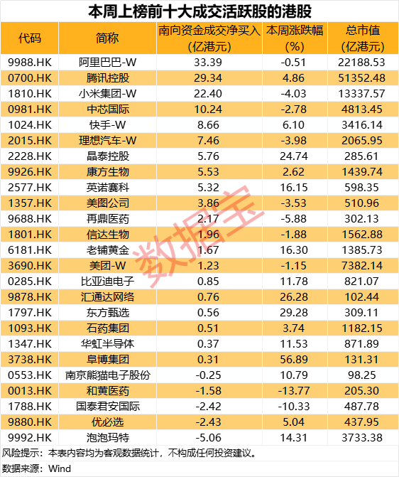 据证券时报·数据宝统计,本周(8月4日至8月10日)南向资金净流入217.51亿港元,环比下降63.15%,今年以来累计净流入达到9008亿港元,首次突破9000亿港元。 中银国际研报认为,随着港股通制度的不断深化,内地南下资金已成为港股市场重要增量资金来源,特别偏好中概股这类具有中资背景、符合新经济方向的标的。相较于美股对中概股在信息披露、审计合规等方面的制度性打压,港股被视为更具制度包容性与政策安全感的资本港湾,因而形成一定的估值溢价预期。 从成交净买入金额来看,大型科技股均获得南向资金加仓。其中,阿里巴巴-W本周获南向资金净买入金额最高,达到33.39亿港元,已连续4周获南向资金持股量增长,最新持股量为15.79亿股,占港股总股数的8.26%。另外腾讯控股、小米集团-W、中芯国际净买入金额均在10亿港元以上。 ![]()
