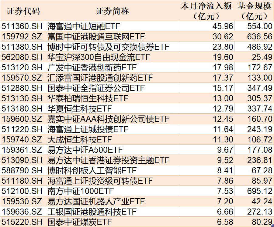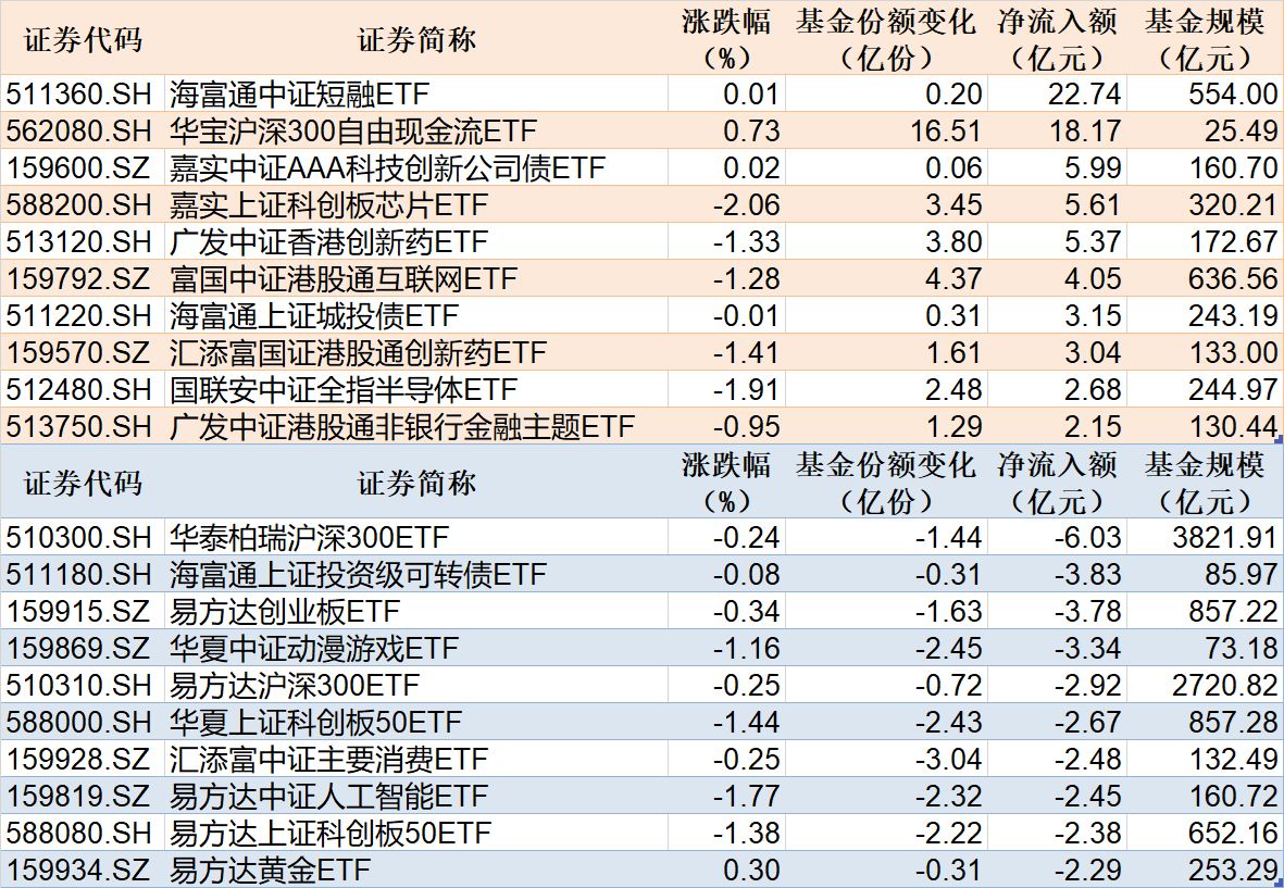 每经记者|叶峰 每经编辑|彭水萍 上周五市场全天窄幅震荡,三大指数小幅下跌。从板块来看,光伏概念股午后爆发,超级水电概念股展开反弹。下跌方面,AI应用股集体调整。 Wind数据显示,在8月8日的非货币ETF市场中,海富通中证短融ETF基金份额增加0.20亿份,净流入额为22.74亿元;华宝沪深300自由现金流ETF份额增加16.51亿份,净流入额为18.17亿元;嘉实中证AAA科技创新公司债ETF份额增加0.06亿份,净流入额为5.99亿元。 与此同时,华泰柏瑞沪深300ETF基金份额减少1.44亿份,净流出额为6.03亿元;海富通上证投资级可转债ETF份额减少0.31亿份,净流出额为3.83亿元;易方达创业板ETF份额减少1.63亿份,净流出额为3.78亿元。 截至8月8日,8月资金净流入额居前20的ETF名单如下: 总体看来,Wind数据显示,8月8日全市场ETF份额为27874.86亿份,总规模为46464.62亿元。份额增加最大的主题为信息,有4只基金跟踪。份额增加最大的指数标的为港股通创新药(+22.08%),有3只基金跟踪;收益最高的指数标的为光伏龙头30(+1.95%),有1只基金跟踪。 封面图片来源:每日经济新闻 |