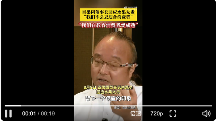 8月10日,“百果园称不会迎合消费者”登上微博热搜,引起了广泛关注。 据东方财经报道,8月8日,百果园董事长余惠勇通过视频公开回应外界对其水果价格过高的质疑,他表示,水果虽是普通商品,但品质差异极大,真正了解水果的消费者却很少。百果园始终坚持做高品质水果,不会为了迎合市场而牺牲品质。 ![]() 在视频中,余惠勇直言:“我想给顾客留下便宜的印象是很容易的,因为不同品质的水果价格差可达四五倍。便宜的水果供大于求,而真正的好水果供不应求,这也是它贵的原因。”他强调,百果园多年来一直走在“教育消费者成熟”的路上,而不是利用消费者的信息不对称来获取短期利益。 此外,余惠勇提到:“我认为商业就两种,第一个利用消费者的无知,第二个教育消费者成熟。我们不会去迎合消费者,我们想告知消费者,最后是消费者自己的选择。但是如果消费者不知情的时候,实际上他是无从选择的,他只能选择便宜,只能看价格。” 他还表示:“一方面我们认为还有空间在成本上继续去优化,看能否以再低一点的价格供应给我们顾客,但是绝不在品质上做让步,除非直接换品相,把品质做差一点、价格便宜点,但这不是我们要走的路。” 8月10日,界面新闻查询名为“百果园余惠勇”的视频号,未发现相关视频。 公开信息显示,百果园创办于2001年。2023年1月,百果园挂牌港交所成功登陆资本市场。 近年来,公司经营业绩面临较大压力。据百果园财报,2024年公司实现收入102.73亿元,同比下降9.8%;毛利为7.64亿元,同比下降41.9%;除所得税前亏损为3.91亿元,而上年同期为盈利3.81亿元。 对于营收下降、扭盈为亏,百果园解释称,2024年面临水果零售业竞争加剧和消费者需求变化的双重挑战,以及自身经营周期调整带来的挑战。门店方面,截至2024年底,百果园的零售门店数量为5127家,同比净减少966家。 截至8月8日收盘,该股报1.75港元/股,股价上涨了6.06%,总市值为26.94亿港元,较前期高点明显回落。 据了解,今年暑期热播剧《长安的荔枝》引发关注,播出期间恰逢新鲜荔枝上市,“百果园荔枝”相关话题量一度引发热烈讨论。公司股价也水涨船高,并且在7月7日当天上涨13.73%,随后公司股价出现回落。