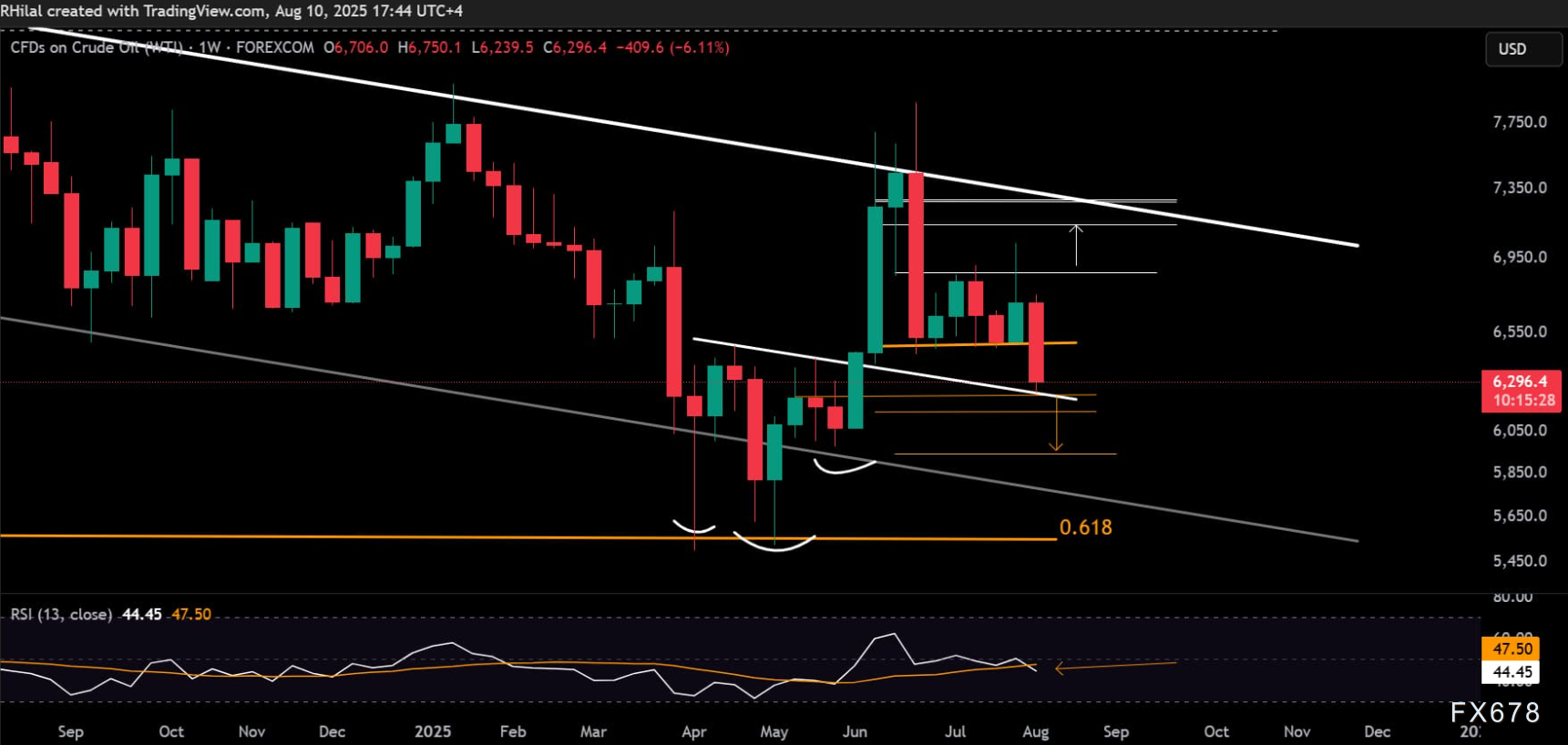 受停火协议的希望和持续的关税风险推动,西德克萨斯中质原油(WTI)跌至关键支撑位62.60美元/桶附近。由于乌克兰停火、OPEC月度报告、中美关税协议和美国CPI报告相关事态发展,预计本周波动可能会加剧。 ![]() 关于WTI,它目前交易在一个关键支撑位,如果交易积极发展,可能会引发早期反弹,或者为60美元区域下方的更深层次跌破奠定基础。 美国经济报告已经增加了原油的下行压力,而与中国相关的关税不确定性可能会放大这种压力,尤其是在协议破裂的情况下。在这种情况下,如果没有达成贸易协议或者出现报复性关税措施,我们可能会看到恐慌性定价和进一步的下行空间——此举可能会改变全球贸易动态,并可能加速独立于美国市场的供应链的形成。 技术分析 ![]() 从周线来看,WTI最新一次下跌目前在5月至6月上涨趋势的0.618斐波那契回调位处企稳,恰好位于倒头肩形态的颈线,即约62.60水平。 斐波那契回调线是从55美元的低点到77.80美元的收盘价绘制的,从而过滤掉了因伊朗和以色列局势升级而产生的突破噪音,该噪音超出了三年下行趋势通道的范围。 若62.60点位被突破,下行风险可能会加速朝通道中段发展,关键支撑位依次为61.40、59.40和55.20。 若62.60点位得以守住,且WTI重新回升至65关口上方,我们可能会看到其回升至通道上沿,上方阻力位分别为68.00、70.00、71.40和72.70。 北京时间10:56,美原油主力合约现报63.51美元/桶。 ![]() |
