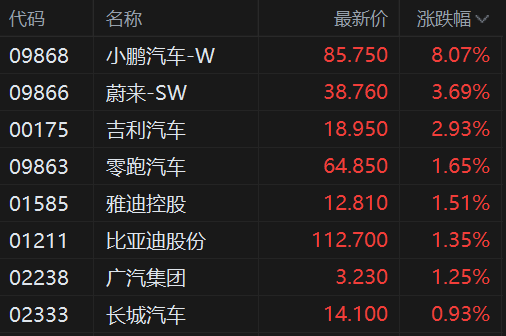 格隆汇8月11日|港股汽车股拉升走强,其中,小鹏汽车涨超8%领衔,蔚来汽车涨近4%,吉利汽车涨近3%,零跑汽车、比亚迪股份、广汽集团涨超1%。