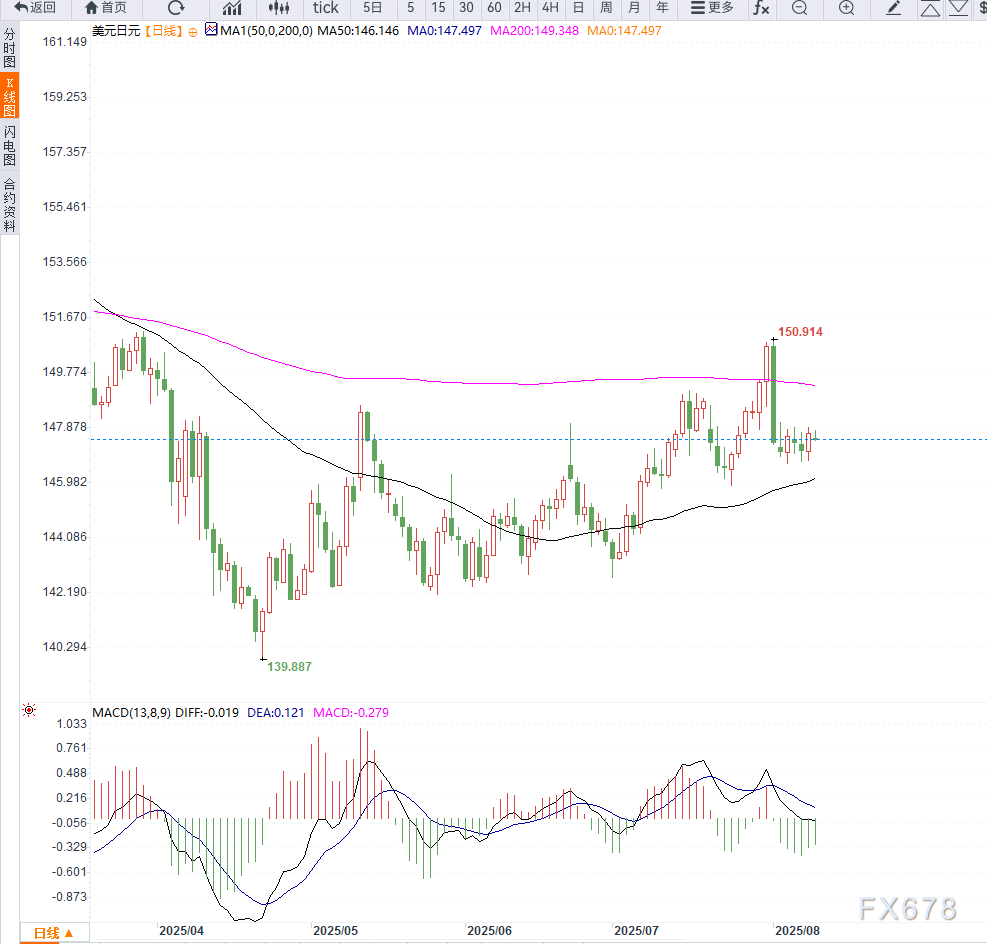 周一,日元在假期带来的低流动性环境中走势温和,美元兑日元维持在过去一周形成的窄幅区间。投资者对日本央行的加息时机仍存分歧。 ![]() 美联储理事Bowman表示,最新的就业疲软迹象凸显了劳动力市场的脆弱性,支持其对今年降息三次的判断。 市场目前预计,美联储9月降息的概率接近90%,这在一定程度上压制了美元反弹。周一美国缺乏重要经济数据,投资者将关注美联储官员讲话,以及本周即将公布的美国CPI、PPI数据与日本二季度GDP初值。 美元兑日元日内维持在147.00至147.80区间震荡,形成矩形整理格局。若汇价能有效突破147.80压力区(对应7月涨势的38.2%斐波那契回撤位),并站稳148.00上方,或将触发买盘推动价格上探148.50区域,进一步目标为149.00关口。 反之,若跌破147.00及146.80(4小时200期均线与50%回撤位重合),将为下行打开空间,目标指向146.00甚至145.00心理关口。 ![]()