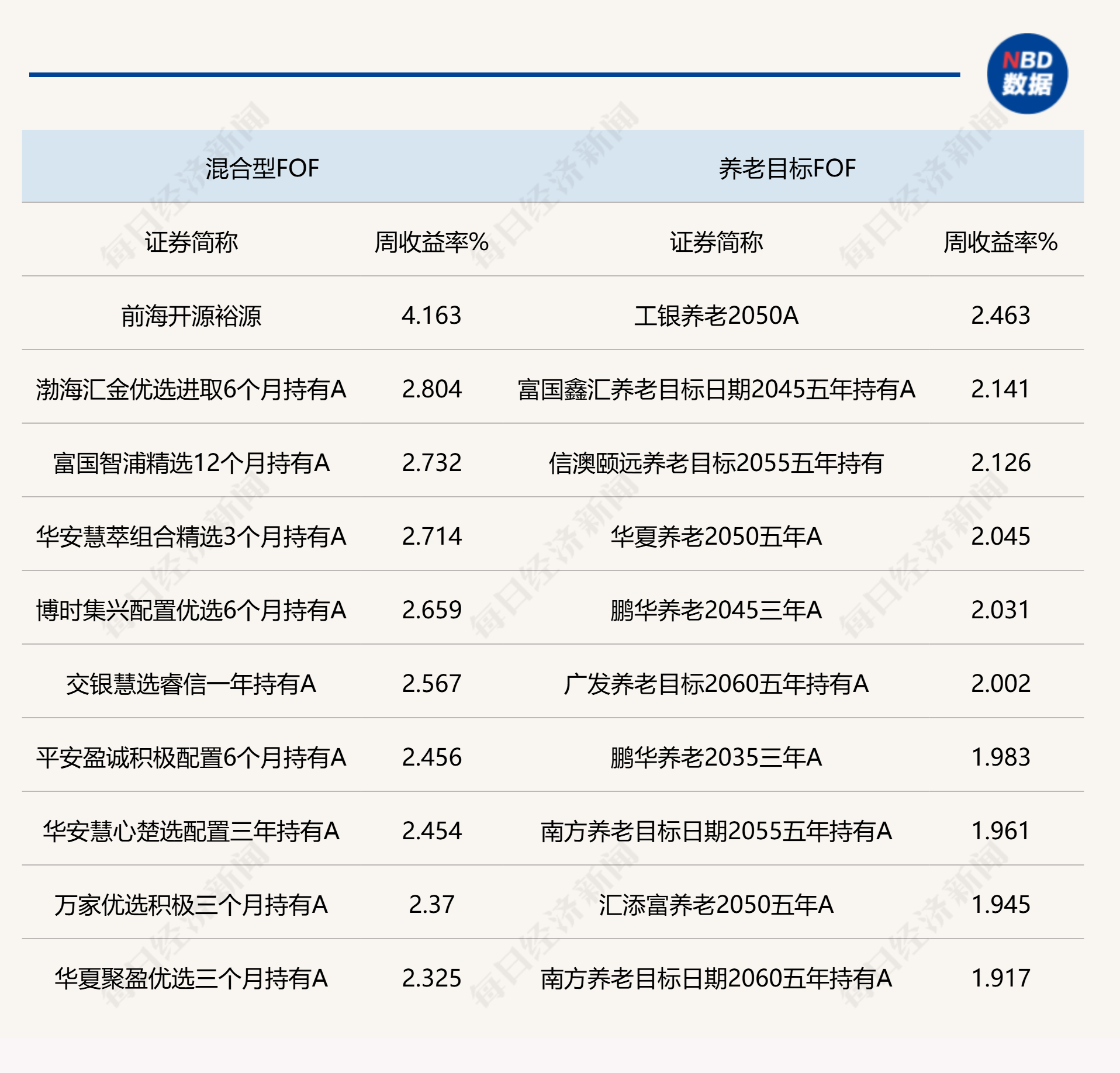 每经记者|任飞 每经编辑|叶峰 上周,伴随着A股市场的反弹,权益类FOF的表现转好,投资胜率高,多只基金单周收益率超过4%。需要指出的是,尽管军工、机械、有色金属等行业是上周表现较好的板块,但对于医药行业的投资机遇,业内依然寄予厚望,且从目前的基金发行来看,不少是重点关注医药投资的产品,未来增量资金可期。 公募FOF单周全部实现正收益 上周(8.4-8.10),公募FOF单周业绩出色,所有基金均实现了正收益。其中,部分产品的单周收益率超过4%。 提及高胜率,权益类FOF的表现时好时坏,特别是在前一周出现调整之后,许多基金的回撤较大,不过,在上周市场反弹过程中,没有任何一只FOF出现负收益。这在过往的单周业绩总结中极其罕见。 国泰行业轮动A上周表现较好,周累计收益率录得4.25%。今年二季度报告显示,该基金重仓了永赢中证沪深港黄金产业股票ETF、国泰中证沪深港黄金产业股票ETF以及国泰中证动漫游戏ETF等,这些基金都在近一周表现出色,部分基金周业绩接近10%。 上周,宽基指数方面,上证指数收于3635.13点,上涨2.11%,深证成指收于11128.67点,上涨1.25%,创业板指收于2333.96点,上涨0.49%。板块方面,国防军工、机械设备、有色金属板块表现较好。 有观点认为,当前的权益市场火爆是基于流动性的充裕而来。例如,当前的A股融资余额已经升至2万亿元,杠杆资金的活跃加剧投资者对本轮行情的认知。 但也有分析指出,融资余额创新高对市场的带动效果有限。国金证券的研报分析指出,随着两融标的不断扩容,融资余额本就存在中枢不断抬升的趋势,事实上两融余额占全A流通市值比重始终平稳,相较2015年存在不少距离。当下融资交易额的活跃确实是市场情绪提升的重要标志,但并不应该作为对市场“定性”的依据。 公司基本面持续向好,部分投资方向热度高 今年以来,市场多个行业出现明显的复苏迹象,如医药、地产以及顺周期资源性行业等,它们或基于政策的扶持,或是周期拐点出现,都较此前的经营预期有了更多想象空间。 尤其是医药生物行业,尽管年内的涨幅已不小,但不少观点认为,依然没有完成估值修复,特别是在一些机构调研的统计当中,此类公司备受机构关注,同时也是公募FOF二季度重仓基金中重点配置的基金主题方向。 根据公募排排网统计,上周共有129家公募机构参与到A股调研活动中,调研覆盖到18个申万一级行业中的62只个股,合计调研次数达498次。医药生物行业个股受到公募机构调研青睐,该行业中,泰恩康、九洲药业和华特达因3只个股入围前十,依次被调研40次、16次和15次。 有业内人士表示,医药、创新药属于高度专业化的领域,一般投资者很难准确分析企业的潜力,因此通过基金间接投资的风险更可控。 今年以来,国内医药,特别是创新药企业不断释放重大签约利好消息,带动市场相关板块走强,公募基金相关主题产品也受到投资者的积极关注与参与。今年二季度,不少公募FOF加仓或新进重仓医药主题基金。 近期,医保局明确提出,“集采不再简单地以最低报价作为参考,同时,对于报价最低的中选企业,要公开说明报价的合理性,并承诺不低于成本报价”,集采规则仍在不断优化中。 对此,永赢基金储可凡表示,对于医疗器械而言,近些年集采不断扩面,一些尚未集采的品类潜在的降价压力成为压制板块估值的重要因素之一。如今,医保局明确表态不再追求最低报价,要求参与集采企业科学报价,对无序的价格竞争形成纠偏,有利于医疗器械企业维持合理的销售价格与利润率。