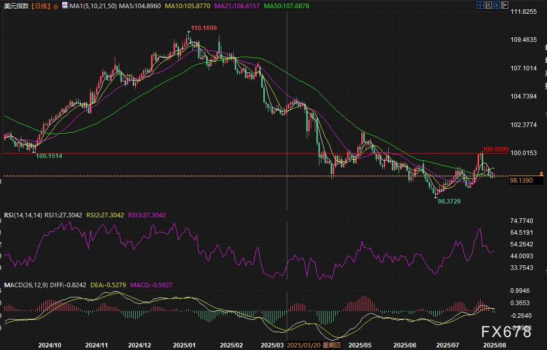 周一 8月11日 亚欧时段美元指数微跌0 09 价格运行在10 20 50日均线下方 中期走势受到压制 目前交投于98 14 处于100整数关口下方 美元指数的波动始终与市场对美元资产吸引力的评估紧密相连 同时美元指数正面临多重 ...