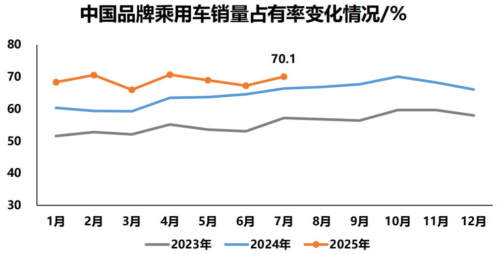 图片来源:中汽协 对于7月全国车市产销出现环比双下滑的原因,中国汽车工业协会副秘书长陈士华解释称,7月,车市进入传统淡季,部分厂家安排年度设备检修,产销节奏有所放缓,环比呈现季节性回落。“从行业市场环境看,以旧换新政策效果继续显现,行业综合整治‘内卷’工作取得积极进展,企业新车型持续投放,助力车市平稳运行,同比实现增长。”陈士华称。 中国汽车工业协会专务副秘书长许海东表示,今年前7个月,我国汽车市场保持12%的增长,说明整个汽车行业在拉动内需、促进消费方面发挥了非常重要的作用。 中国品牌乘用车7月市占率达70.1% 7月,汽车以旧换新政策持续显效,企业新车型持续投放上市,助力乘用车市场平稳运行,销量同比实现增长。中汽协数据显示,全国乘用车产销分别完成229.3万辆和228.7万辆,同比分别增长13%和14.7%。1至7月,全国乘用车产销分别完成1583.8万辆和1584.1万辆,同比分别增长13.8%和13.4%。 中国品牌乘用车销量占比保持高位。中汽协数据显示,7月,中国品牌乘用车共销售160.4万辆,同比增长21.3%,占乘用车销售总量的70.1%,销量占有率比上年同期提升3.8个百分点。在主要外国品牌中,与上月相比,法系品牌销量呈两位数增长,其他四大主要品牌销量均呈不同程度下降;与上年同期相比,德系品牌和法系品牌销量呈不同程度下降,其他三大主要品牌销量均呈不同程度增长。