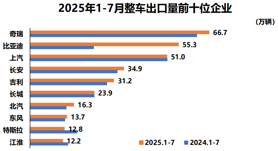 图片来源:中汽协 1至7月,整车出口前十企业中,奇瑞出口量达66.7万辆,同比增长7.3%,占总出口量的18.1%。与上年同期相比,比亚迪出口增速最为显著,出口达55.3万辆,同比增长1.3倍。 展望下半年,中汽协方面表示,汽车行业仍需要稳定政策预期,规范市场竞争秩序,加强行业自律,强化政策引导与监管,助力行业健康平稳运行。“国家政策的明确将有助于稳定消费信心,持续提振汽车消费,确保下半年行业平稳运行。”陈士华称。 每日经济新闻 (责任编辑:郭健东 )