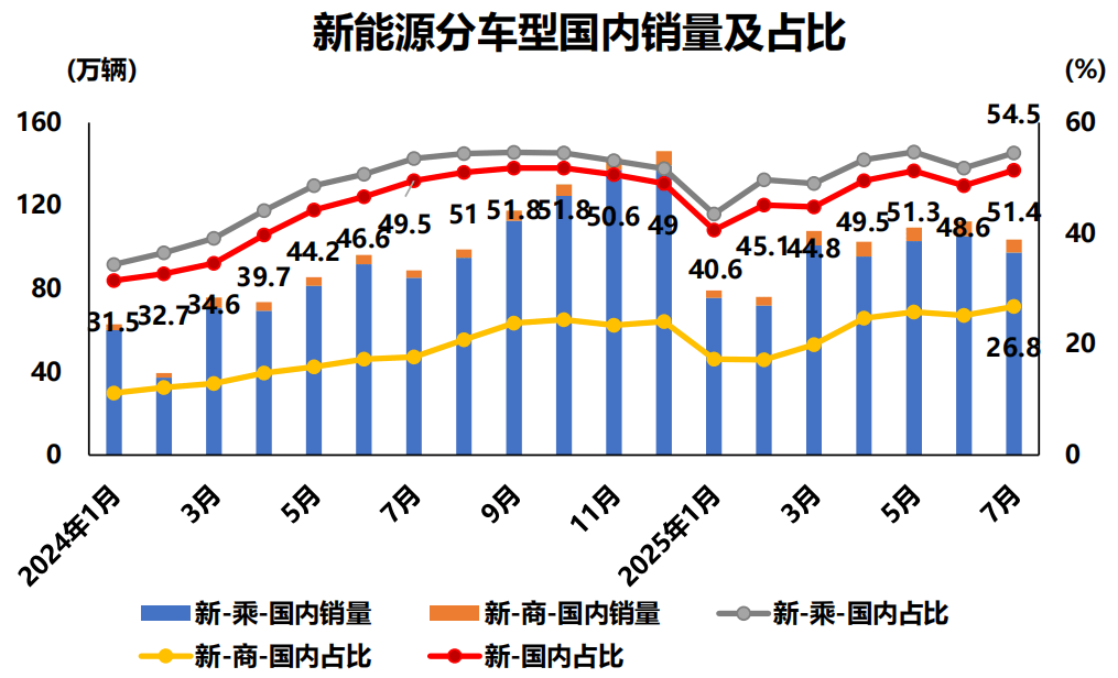 图片来源:中汽协 1至7月,中国品牌乘用车销量为1087.3万辆,同比增长24.4%,销量占有率为68.6%,较上年同期上升6.1个百分点。乘联分会秘书长崔东树分析称,随着自主车企在新能源路线上“多线并举”策略的实施,以及在高端车市场的突破,中国品牌乘用车市场基盘将持续扩大。 商用车方面,虽然其7月产销较6月出现明显下滑,但仍保持两位数同比高增长。中汽协数据显示,7月商用车产销分别完成29.8万辆和30.6万辆,环比分别下降15.8%和17.1%,同比分别增长16.3%和14.1%。在商用车主要品种中,与上月相比,客车和货车产销均呈两位数下降;与上年同期相比,客车和货车产销均呈不同程度增长。 细分来看,7月,货车产销分别完成25.4万辆和26.4万辆,环比分别下降16.3%和16.4%,同比分别增长15.1%和13.8%;客车产销分别完成4.4万辆和4.2万辆,环比分别下降12.3%和21.2%,同比分别增长23.7%和16.3%。 1至7月,商用车产销分别完成239.7万辆和242.8万辆,同比分别增长6%和3.9%。其中,天然气商用车销量为13.4万辆,同比下降9.6%。其中,货车产销分别完成209.2万辆和212.1万辆,同比分别增长5.4%和3.1%;客车产销分别完成30.5万辆和30.7万辆,同比分别增长10.3%和9.7%。 新能源汽车成拉动出口增长主要动力 作为车市增长的最大亮点,7月新能源汽车延续了快速增长态势。数据显示,7月,全国新能源汽车产销分别完成124.3万辆和126.2万辆,同比分别增长26.3%和27.4%。 7月,新能源汽车新车销量达到汽车新车总销量的48.7%,其中新能源汽车国内销量占比达到51.4%。这是去年12月新能源汽车国内销量占比跌破50%以来,首次重回50%以上的高位。