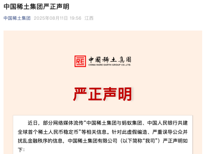 08月11日晚,中国稀土集团有限公司发布严正声明,辟谣“中国稀土集团与蚂蚁集团、中国人民银行共建全球首个稀土人民币稳定币”等相关信息。 公司严正声明如下: 近日,部分网络媒体流传“中国稀土集团与蚂 ...