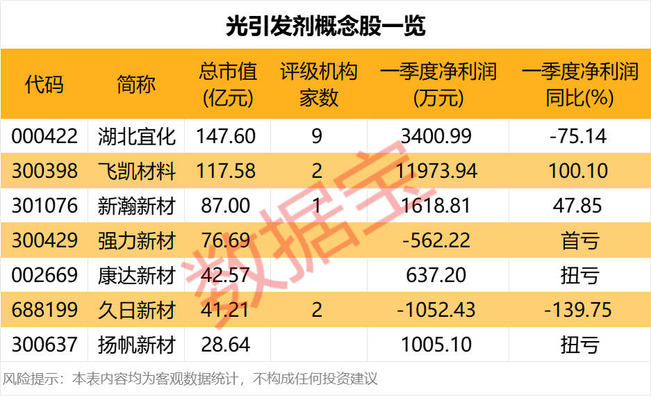 相关概念股出炉 据证券时报·数据宝不完全统计,A股市场参与光引发剂生产的上市公司主要有7家,其中久日新材、强力新材、扬帆新材为国内龙头,此外,新瀚新材、飞凯材料、康达新材、湖北宜化也有相关产品。 从光引发剂国内产能来看,2024年,久日新材产能约为2.3万吨、强力新材约为1.7万吨、沃凯珑约为1.3万吨、IGM约为1.2万吨、扬帆新材约为0.8万吨、固润科技约为0.5万吨。 根据中国感光学会辐射固化专业委员会数据,2024年我国光引发剂产量为5.9万吨,同比增长5.4%。根据上市公司2024年年报数据,2024年久日新材、强力新材、扬帆新材光引发剂产量分别为1.99万吨、0.73万吨、0.40万吨,占行业总产量的52.73%。 久日新材是国内光引发剂生产领军企业。公司在投资者互动平台表示,第二季度,公司光引发剂价格整体都在调整,但仍存在一些低价订单需要消化,国内光引发剂907、184、TPO、ITX等产品的价格有所上涨。公司光引发剂产品的下游客户包含光固化涂料和胶黏剂生产企业,其产品可部分用于人形机器人的生产制造。公司和客户正在合作开发可用于高端光刻胶的阳离子光引发剂。 扬帆新材在互动平台回复,公司部分产品如光引发剂产品907等下游可应用于PCB、3D打印等领域。 飞凯材料在互动平台回复,TMO作为新一代光引发剂,其应用范围涵盖了LED固化、电子器件制造以及3D打印等领域,主要被应用于UV光固化涂料、油墨、胶黏剂等精细化工产品之中,为这些行业提供了高效、环保的解决方案。 湖北宜化则表示,公司参股的湖北有宜新材料有限公司具备40吨/年的APi-1206光引发剂产能,以销定产,价格随行就市,具有长期稳定的客户。 ![]() (文章来源:证券时报网) |