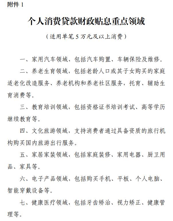 关于印发《个人消费贷款财政贴息政策实施方案》的通知 财金〔2025〕80 号 各省、自治区、直辖市、计划单列市财政厅(局),新疆生产建设兵团财政局,中国人民银行上海总部,各省、自治区、直辖市及计划单列市分行,金融监管总局各监管局,有关金融机构: 为贯彻落实党中央、国务院关于大力提振消费、全方位扩大国内需求的决策部署,我们研究制定了《个人消费贷款财政贴息政策实施方案》,现印发给你们,请遵照执行。 财政部 中国人民银行 金融监管总局 2025年8月4日 个人消费贷款财政贴息政策实施方案 为贯彻落实党中央和国务院关于大力提振消费、全方位扩大国内需求的决策部署,根据中央办公厅、国务院办公厅印发的《提振消费专项行动方案》关于2025年对符合条件的个人消费贷款给予财政贴息的要求,更好发挥财政资金对提振消费的支持引导作用,降低居民消费信贷成本,助力释放居民消费潜力,促进经济加快向好发展,制定本实施方案。 一、政策内容 (一)支持范围。2025年9月1日至2026年8月31日期间,居民个人使用贷款经办机构发放的个人消费贷款(不含信用卡业务)中实际用于消费,且贷款经办机构可通过贷款发放账户等识别借款人相关消费交易信息的部分,可按规定享受贴息政策。贴息范围包括单笔5万元以下消费,以及单笔5万元及以上的家用汽车、养老生育、教育培训、文化旅游、家居家装、电子产品、健康医疗等重点领域消费(详见附件1)。对于单笔5万元以上的消费,以5万元消费额度为上限进行贴息。政策到期后,可视实施效果研究延长政策期限、扩大支持范围。 (二)贴息标准。年贴息比例为1个百分点(按符合条件的实际用于消费的个人消费贷款本金计算),且最高不超过贷款合同利率的50%,中央财政、省级财政分别承担贴息资金的90%、10%。贷款合同利率需要符合相应利率自律约定。政策执行期内,每名借款人在一家贷款经办机构可享受的全部个人消费贷款累计贴息上限为3000元(对应符合条件的累计消费金额30万元),其中在一家贷款经办机构可享受单笔5万元以下的个人消费贷款累计贴息上限为1000元(对应符合条件的累计消费金额10万元)。 (三)贷款经办机构。一是6家国有大型商业银行,包括中国工商银行股份有限公司、中国农业银行股份有限公司、中国银行股份有限公司、中国建设银行股份有限公司、交通银行股份有限公司、中国邮政储蓄银行股份有限公司。二是12家全国性股份制商业银行,包括中信银行股份有限公司、中国光大银行股份有限公司、华夏银行股份有限公司、中国民生银行股份有限公司、招商银行股份有限公司、兴业银行股份有限公司、广发银行股份有限公司、平安银行股份有限公司、上海浦东发展银行股份有限公司、恒丰银行股份有限公司、浙商银行股份有限公司、渤海银行股份有限公司。三是5家其他个人消费贷款发放机构,包括深圳前海微众银行股份有限公司、重庆蚂蚁消费金融有限公司、招联消费金融股份有限公司、兴业消费金融股份有限公司、中银消费金融有限公司。鼓励地方财政部门结合实际情况对其他经营个人消费贷款业务的金融机构给予财政贴息支持,扩大政策覆盖面。 二、组织实施 (一)贴息资金预拨。自本实施方案发布之日起30天内,贷款经办机构总部预估总体及分省份个人消费贷款发放情况和贴息资金需求,向财政部报送贴息资金预拨申请,填报《个人消费贷款财政贴息资金预拨申请表》。贷款经办机构省级机构应同时向属地省级财政部门报送本机构个人消费贷款预计发放情况和贴息资金需求;贷款经办机构无分支机构的,由总部向注册地省级财政部门报送相关申请材料。财政部结合各贷款经办机构贴息资金申请情况和年度预算安排,向省级财政部门按一定比例预拨个人消费贷款贴息资金。 (二)贴息贷款结息。贷款经办机构按照市场化、法治化原则和相关信贷管理规定自主开展差异化授信,合理设置消费贷款额度、期限、利率,自主决策贷款发放条件并及时放款,有效加强信贷资金用途和风险管控。贷款经办机构对相关个人消费贷款进行结息时,按照政策规定的贴息比例、贴息上限等要求计算财政贴息金额,在向借款人收取贷款利息时直接扣减应由财政承担的贴息资金,并结合各自情况通过手机短信、APP通知等方式向借款人告知财政贴息具体情况。 (三)贴息资金申请。贷款经办机构省级机构对所辖分支机构上季度贴息资金情况进行严格审核后,于政策实施期内每季度结束后5个工作日内,向属地省级财政部门和金融监管局报送上季度贴息资金拨付申请,填报《个人消费贷款财政贴息资金申请表(季度)》,并附相关证明材料,同时抄送财政部当地监管局。贷款经办机构无分支机构的,由总部向注册地省级财政部门和金融监管局报送相关申请材料,同时抄送财政部当地监管局。 (四)贴息资金拨付。各金融监管局收到贷款经办机构报送的季度贴息资金申请材料后,对贷款经办机构个人消费贷款发放和贴息金额等数据进行汇总,于15个工作日内向省级财政部门提供贷款经办机构贴息资金汇总数据等材料。省级财政部门收到当地金融监管局提供的材料后,于10个工作日内完成上季度贴息资金审核拨付工作。对于审核未通过的个人消费贷款,由省级财政部门相应核减贴息资金;已向借款人支付贴息