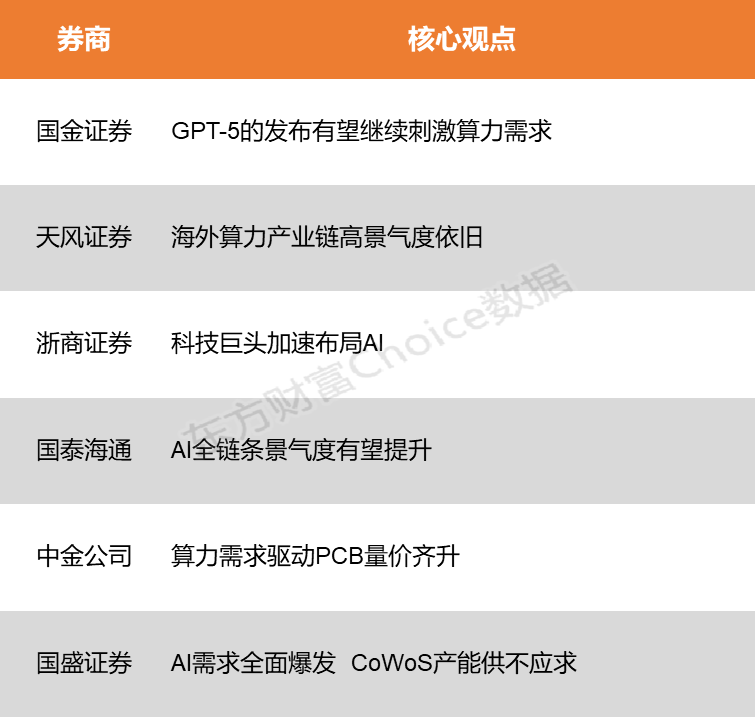 A股三大指数午后震荡上涨,沪指七连阳再创年内新高,截至收盘,上证指数涨0.5%,深证成指涨0.53%,创业板指涨1.24%。沪深两市超2000只个股上涨,成交金额超1.9万亿元。 盘面上,半导体板块大涨,寒武纪20%涨停;CPO概念走强,光库科技20%涨停;光刻机概念、服务器、AI算力等板块也涨幅居前,稀土、培育钻石、盐湖提锂等板块跌幅居前。 近日,OpenAI正式发布GPT-5,并在多个领域的表现都迎来了全面提升。主要亮点包括更强的代码能力、更低的幻觉率,根据需求智能切换模型版本以及支持个性化设定等。同时有传闻DeepSeek-R2的预计发布时间窗口为2025年8月15日至8月30日,但具体日期尚未官宣。 国金证券指出,GPT-5的发布有望继续刺激算力需求,此外,头部云厂商与模型厂商在前沿模型的探索仍然继续。天风证券表示,海外算力产业链高景气度依旧,并未受到DeepSeek和贸易摩擦的冲击,反而相关产业链的基本面共振更强,持续看好海外算力产业链投资机会,看好AI行业作为年度投资主线。 ![]() 国金证券:GPT-5的发布有望继续刺激算力需求 GPT-5的发布有望继续刺激算力需求,此外,头部云厂商与模型厂商在前沿模型的探索仍然继续。该机构认为,随着推理需求爆发,英伟达GB200等产品积极拉货,产业链或将迎来旺季。 天风证券:海外算力产业链高景气度依旧 海外算力产业链高景气度依旧,并未受到DeepSeek 和贸易摩擦的冲击,反而相关产业链的基本面共振更强,持续看好海外算力产业链投资机会。坚定看好AI 行业作为年度投资主线,国内方面,后续伴随着DeepSeek R2/V4 等以及包括Agent、多模态方面相关进展,仍然看好AI 行业以及围绕AIDC 产业链的持续高景气。 浙商证券:科技巨头加速布局AI 2025年上半年度谷歌、微软、亚马逊,Meta资本开支总计为1593.84亿美元(不含融资租赁),同比大涨24.4%。且二季度环比增长明显,超市场预期,反映出各大厂商在AI基础设施扩张上的持续投入意愿。浙商证券还指出,科技巨头加速布局AI,还将推动云业务提速,为广告、零售、智能终端等场景带来深层变革。 国泰海通:AI全链条景气度有望提升 过去一个月人工智能政策密集出台,上海新政推出 10 亿元专项补贴券直击 AI 应用落地难的产业痛点,国常会通过“人工智能 +”行动深入 AI 产业发展,国产大模型及 AI agent 发展落地将持续加速,有望带动算力、数据、应用等AI全链条景气度提升。