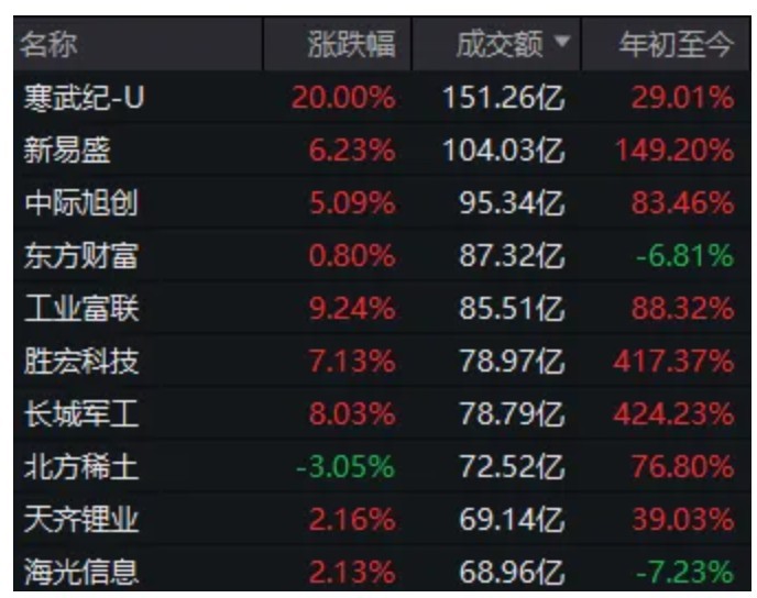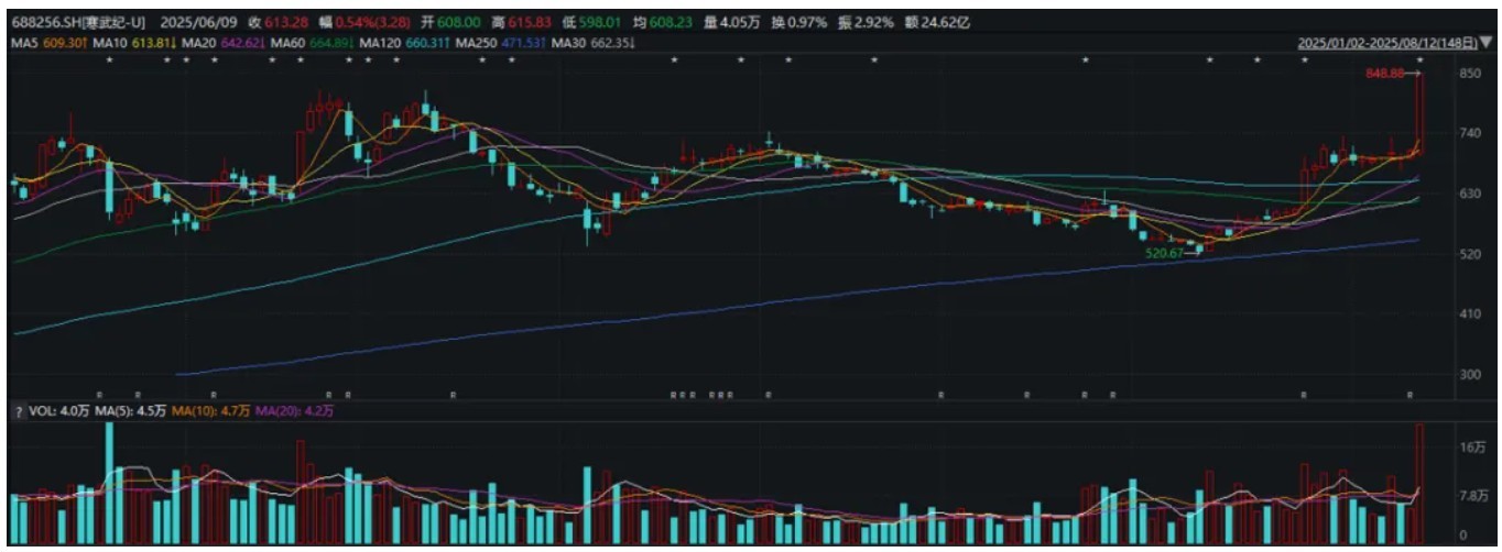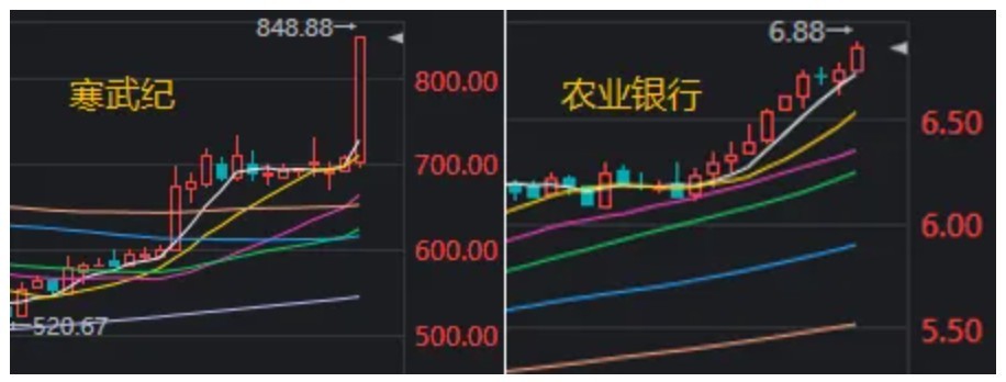 每经记者|肖芮冬 每经编辑|叶峰 8月12日,市场全天震荡走高,沪指录得7连阳,三大指数均再创年内新高。截至收盘,沪指涨0.5%,深成指涨0.53%,创业板指涨1.24%。 板块方面,半导体、港口、CPO、新疆等板块涨幅居前,PEEK材料、稀土永磁、军工、锂矿等板块跌幅居前。 个股跌多涨少,全市场超3100只个股下跌。沪深两市全天成交额1.88万亿元,较上个交易日放量545亿。 在上周日的前瞻文章中我们认为,有两个关键板块将影响本周行情: 一是银行,二是科技主线。 没想到,这一预测周二就得以应验。 今天,在银行、券商、多元金融等大金融板块的“护航”下,沪指继续奔向3674点,收盘点位已来到3665.92点。 农业银行连续6个交易日创历史新高,券商股中的国盛金控也迎来涨停。 另一边,科创50指数涨幅领先,以今天20cm涨停、股价创历史新高的寒武纪为代表,(国产)半导体、光刻机等概念成为科技线“最锋利的矛”;新易盛、胜宏科技、工业富联等热门股也纷纷新高。 加上中际旭创,上述五只科技股均登上了今天成交额榜的前六位。 那么问题来了,你觉得:寒武纪、农业银行同日创新高,意味着什么? 我们认为,用五个字来回答就足矣—— 行情,没走完。 农业银行,连续6天创新高 继“打不过”的工商银行之后,农业银行(601288)的表现也逐渐“无敌”。行情数据显示,其近11个交易日有10天上涨,唯一没涨的8月8日,也以平盘报收,近6个交易日,股价连续创下历史新高。 有分析认为,大金融上涨或与半年报披露进入高峰期有关,根据以往经验,财报季高股息个股往往成为市场追逐热点。特别是近年来在政策推动、上市公司稳健发展的背景下,A股多数上市公司积极进行分红,甚至进行季度、年中分红,高股息更受资金青睐。 对于银行板块后市,财信证券表示,在无风险利率下行和资产荒的大背景下,当前银行板块股息率仍具有吸引力,以险资为代表的长线资金、以沪深300ETF为代表被动资金或延续流入态势,公募基金考核导向长周期化的背景下,银行板块有望迎来增配机遇。 另一方面,券商板块盘中也出现放量拉升走势,国盛金控强势涨停,股价创年内新高,在板块内“一枝独秀”。 原因在于,受益于资本市场的活跃度提升,券商股业绩普遍大幅增长。比如华安证券、国元证券2025年上半年业绩快报净利润增速均超过40%;华西证券预计上半年净利润增长10倍~13倍,申万宏源、东北证券、哈投股份等均预增超100%。 光大证券指出,当市场冲击关键点位时,大金融板块就成为冲关的关键领域。随着下半年美联储有望延续降息周期,这或将打开国内降息空间,将对金融股形成重要的影响。 848.88元! “寒王”为何今日爆发? 截至收盘,寒武纪以151.26亿元的成交额高居全市场首位,大幅领先第二名的新易盛(104.03亿元)。 回顾历史行情不难发现,在今日爆量涨停之前,“寒王”的股价自今年一季度创下前高后,便总体处于回调震荡格局。 7月10日前后,其股价一度跌至年线上方,才开启了本轮上涨。今天其久违涨停,也带动了科创芯片板块集体爆发。海光信息、华虹公司、芯原股份、中芯国际等科创板权重股纷纷走强。 据报道,有观点指出,市场再度传出?DeepSeek-R2发布的时间窗口,对国产算力芯片板块构成一定利好刺激。另外,此前寒武纪公告定增方案调整公告、定增预案修订稿及定增审核问询函回复等一系列公告,定增募集资金总额从不超过49.8亿下修调整为不超过39.9亿元。 有券商认为,该公司定增下修募资总额,股权稀释减少,顺利完成概率有望提升。公司新一代产品提升方向初现,竞争力提升值得期待,且存货结转显示经营态势向好。另外,模型能力提升和未来应用繁荣趋势下AI芯片中长期天花板进一步抬升,AI算力芯片行业市值天花板进一步打开。前期外围芯片恢复供应的行业压制预期逐渐消化,行业需求旺盛,公司在国产AI芯片竞争力突出,总量和份额双升逻辑不改。 而对于整个行业,国信证券指出,半导体行业维持高景气,台积电将年收入增速预期由25%上调至30%,佐证行业高景气延续。北美算力强势上涨带动交换机及服务器产业链成为情绪拉动点,AI需求持续强劲,非AI需求温和复苏。 2Q25全球硅晶圆出货面积同环比增长,创3Q23以来的新高,显示存储以外的部分领域开始复苏,AI数据中心芯片的硅晶圆需求依然强劲。利基存储价格逐步回暖,NOR Flash与SLC NAND需求回温,部分产品价格开始上扬,预期三季度持续回暖。海外科技大厂持续加大资本开支,上调资本开支计划,表明AI算力投入依旧火热。 国产算力自主可控重要性提升,因地缘政治、网络安全等限制,发展国产算力芯片从设计到制造的全面自主可控进程有望加速。电子板块在“宏观政策周期、产业库存周期、AI创新周期”共振下有望迎来“估值扩张”行情。 封面图片来源:每日经济新闻 |