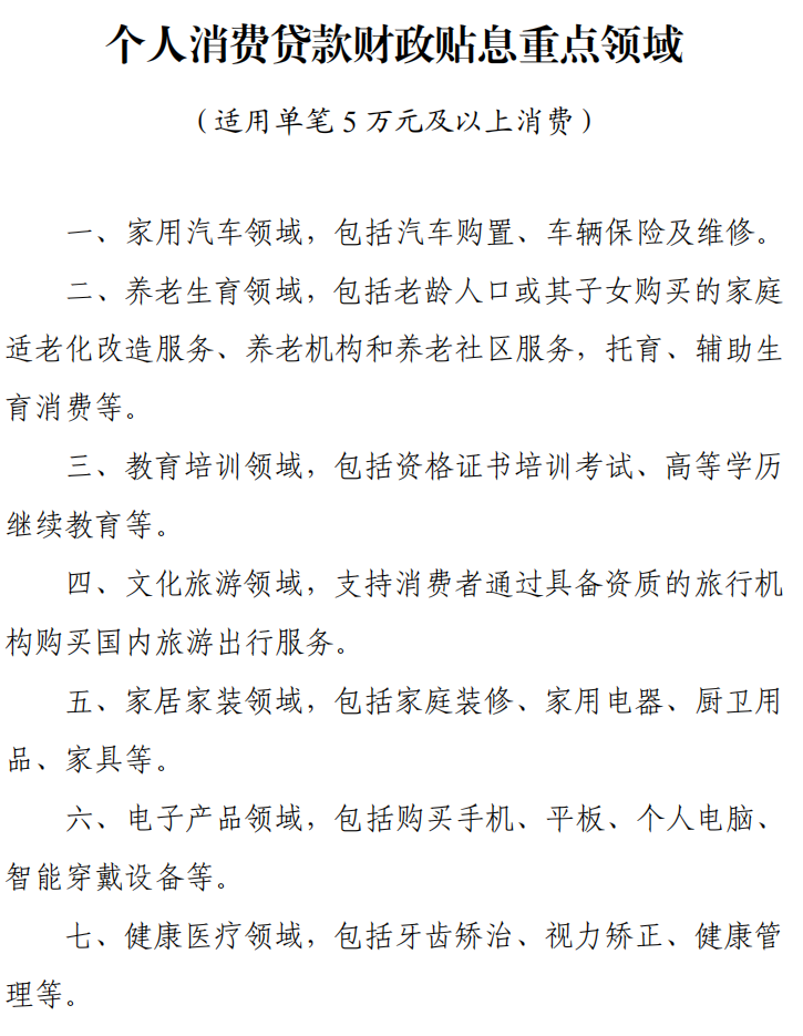 个人消费贷款财政贴息政策落地。 8月12日,财政部发布消息称,为贯彻落实党中央和国务院关于大力提振消费、全方位扩大国内需求的决策部署,根据中央办公厅、国务院办公厅印发的《提振消费专项行动方案》关于2025年对符合条件的个人消费贷款给予财政贴息的要求,更好发挥财政资金对提振消费的支持引导作用,降低居民消费信贷成本,助力释放居民消费潜力,促进经济加快向好发展,财政部、中国人民银行、金融监管总局制定了《个人消费贷款财政贴息政策实施方案》(下称《实施方案》)。 7月31日召开的国常会部署实施个人消费贷款贴息政策与服务业经营主体贷款贴息政策,会议指出,对个人消费贷款和服务业经营主体贷款进行贴息,有利于通过财政金融联动的方式,降低居民信贷成本和服务业经营主体融资成本,更好激发消费潜力、提升市场活力。 贴息范围包括单笔5万元以下消费以及单笔5万元及以上的重点领域消费 2025年9月1日至2026年8月31日期间,居民个人使用贷款经办机构发放的个人消费贷款(不含信用卡业务)中实际用于消费,且贷款经办机构可通过贷款发放账户等识别借款人相关消费交易信息的部分,可按规定享受贴息政策。 贴息范围包括单笔5万元以下消费,以及单笔5万元及以上的家用汽车、养老生育、教育培训、文化旅游、家居家装、电子产品、健康医疗等重点领域消费(具体如下图)。 ![]() 年贴息比例为1个百分点,每人在一家贷款经办机构可享受的全部个人消费贷款累计贴息上限为3000元 《实施方案》明确,对于单笔5万元以上的消费,以5万元消费额度为上限进行贴息。政策到期后,可视实施效果研究延长政策期限、扩大支持范围。 《实施方案》明确,年贴息比例为1个百分点(按符合条件的实际用于消费的个人消费贷款本金计算),且最高不超过贷款合同利率的50%,中央财政、省级财政分别承担贴息资金的90%、10%。贷款合同利率需要符合相应利率自律约定。 同时,政策执行期内,每名借款人在一家贷款经办机构可享受的全部个人消费贷款累计贴息上限为3000元(对应符合条件的累计消费金额30万元),其中在一家贷款经办机构可享受单笔5万元以下的个人消费贷款累计贴息上限为1000元(对应符合条件的累计消费金额10万元)。 18家银行和5家其他个人消费贷款发放机构经办的个人消费贷款可以贴息 通过哪些机构办理的个人消费贷款可以享受贴息?《实施方案》明确,国有大行、全国性股份制银行以及微众银行、蚂蚁消金等5家个人消费贷款发放机构经办的个人消费贷款均可以享受。具体来说: 一是6家国有大型商业银行,包括中国工商银行股份有限公司、中国农业银行股份有限公司、中国银行股份有限公司、中国建设银行股份有限公司、交通银行股份有限公司、中国邮政储蓄银行股份有限公司。 二是12家全国性股份制商业银行,包括中信银行股份有限公司、中国光大银行股份有限公司、华夏银行股份有限公司、中国民生银行股份有限公司、招商银行股份有限公司、兴业银行股份有限公司、广发银行股份有限公司、平安银行股份有限公司、上海浦东发展银行股份有限公司、恒丰银行股份有限公司、浙商银行股份有限公司、渤海银行股份有限公司。 三是5家其他个人消费贷款发放机构,包括深圳前海微众银行股份有限公司、重庆蚂蚁消费金融有限公司、招联消费金融股份有限公司、兴业消费金融股份有限公司、中银消费金融有限公司。 《实施方案》也鼓励地方财政部门结合实际情况对其他经营个人消费贷款业务的金融机构给予财政贴息支持,扩大政策覆盖面。 《实施方案》要求,贷款经办机构按照市场化、法治化原则和相关信贷管理规定自主开展差异化授信,合理设置消费贷款额度、期限、利率,自主决策贷款发放条件并及时放款,有效加强信贷资金用途和风险管控。贷款经办机构对相关个人消费贷款进行结息时,按照政策规定的贴息比例、贴息上限等要求计算财政贴息金额,在向借款人收取贷款利息时直接扣减应由财政承担的贴息资金,并结合各自情况通过手机短信、APP通知等方式向借款人告知财政贴息具体情况。 (文章来源:澎湃新闻) |