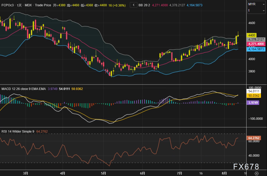 周二 8月12日 马来西亚衍生品交易所 BMD 棕榈油主力合约 FCPOc3 今日延续反弹 10月合约收盘上涨16林吉特 0 36 报4400林吉特 吨 连续第三个交易日收高 技术指标显示 日线级别MACD维持金叉但柱状收窄 RS ...