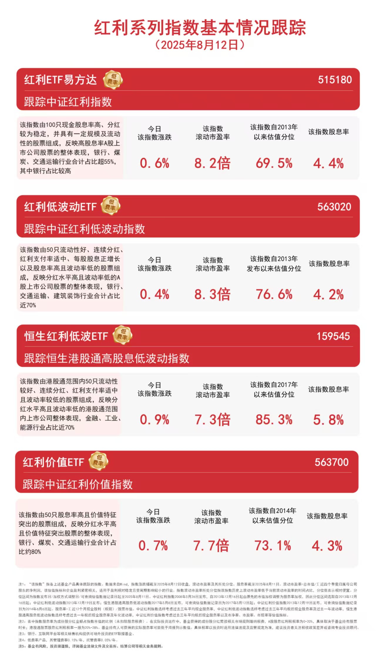红利板块集体走强,截至收盘,恒生港股通高股息低波动指数上涨0.9%,中证红利价值指数上涨0.7%,中证红利指数上涨0.6%,中证红利低波动指数上涨0.4%。Wind数据显示,恒生红利低波ETF(159545)今日获超2700万份净申购,截至昨日,该产品连续5个交易日获资金净流入,最新规模达42.3亿元、创历史新高。 公告显示,恒生红利低波ETF(159545)将实施今年第三次现金分红,每10份基金份额分红0.14元,权益登记日为8月12日,除息日为8月13日,现金红利发放日为8月15日,该ETF此前在今年2月份和5月份共进行了两次分红,合计分红金额超1900万元。 |