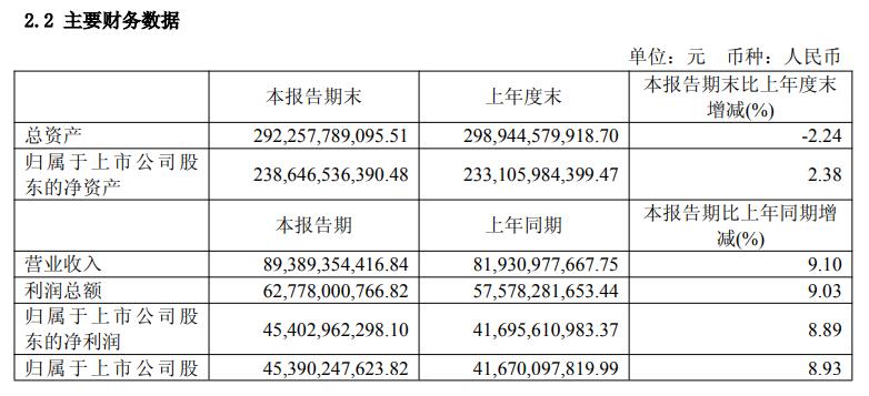 贵州茅台(600519)8月12日晚间发布2025年半年报,上半年营业收入893.89亿元,同比增长9.1%;归母净利润454.03亿元,同比增长8.89%。上半年,公司茅台酒基酒产量约4.37万吨,系列酒基酒产量约2.96万吨,各轮次基酒符合轮次特征,生产质量稳中向好。 ![]()