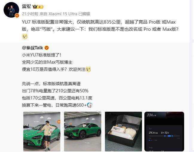 8月11日晚,小米(HK01810)创始人雷军在社交平台发文称,YU7标准版配置非常强大,仅续航就高达835公里,超越了竞品“Pro版”或“Max版”,绝非“丐版”。他向广大网友征求意见:小米YU7标准版是不是也改名成Pro版或Max版。