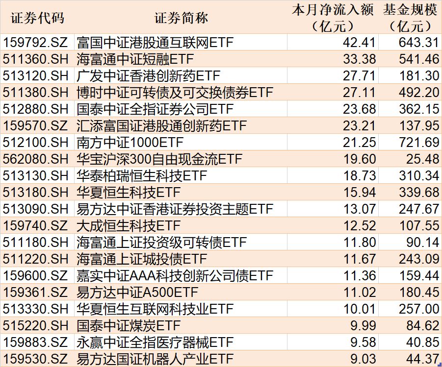 每经记者|叶峰 每经编辑|彭水萍 昨日市场全天震荡走高,三大指数均再创年内新高。从板块来看,芯片股午后爆发。下跌方面,军工、稀有金属等个股展开调整。 Wind数据显示,在8月12日的非货币ETF市场中,华夏恒生互联网科技业ETF基金份额增加18.04亿份,净流入额为9.36亿元;鹏扬中债-30年期国债ETF份额增加0.06亿份,净流入额为7.12亿元;博时中证可转债及可交换债券ETF份额增加0.53亿份,净流入额为6.93亿元。 与此同时,华夏上证科创板50ETF基金份额减少22.50亿份,净流出额为25.15亿元;嘉实上证科创板芯片ETF份额减少7.68亿份,净流出额为12.81亿元;国联安中证全指半导体ETF份额减少7.26亿份,净流出额为8.00亿元。 截至8月12日,8月资金净流入额居前20的ETF名单如下: 总体看来,Wind数据显示,8月12日全市场ETF份额为27853.62亿份,总规模为46849.47亿元。份额增加最大的主题为医药,有9只基金跟踪。份额增加最大的指数标的为恒生互联网科技业(+3.66%),有3只基金跟踪;收益最高的指数标的为科创芯片设计(+3.67%),有1只基金跟踪。 封面图片来源:每日经济新闻 |