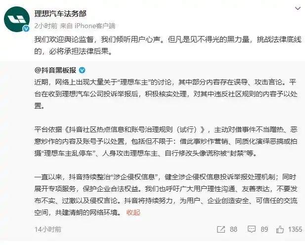 格隆汇8月13日|理想汽车法务部发文:“我们欢迎舆论监督,我们倾听用户心声。但凡是见不得光的黑力量,挑战法律底线的,必将承担法律后果。” 8月12日,抖音黑板报发文称 :“近期,网络上出现大量关于“理想车主”的讨论,其中部分内容存在误导、攻击言论。平台在收到理想汽车公司投诉举报后,积极核实处理,对其中违反社区规则的内容予以处置。 平台依据《抖音社区热点信息和账号治理规则(试行)》,主动对借事件不当蹭热、恶意炒作的内容及账号予以处置,包括但不限于:借此事炒作营销、同质化演绎恶搞或拍摄“理想车主乱停车”、人身攻击理想车主、自行修改头像谎称被“封禁”等。 一直以来,抖音持续整治“涉企侵权信息”,健全涉企侵权信息投诉举报处理机制;同时展开专项服务,保护企业合法权益。我们也呼吁广大用户理性沟通、友善表达,不要发布不实、过激以及侵权言论。抖音将持续努力,为用户、企业创造安全、可信任的交流空间,共建清朗的网络环境。”
