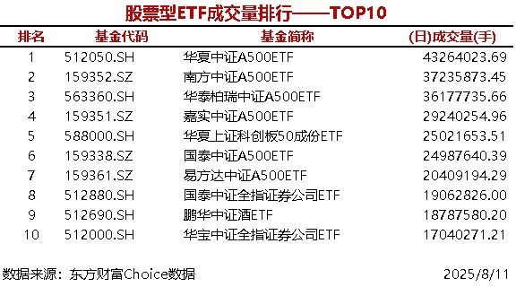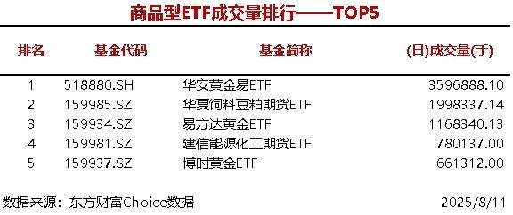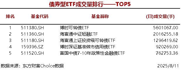 每经AI快讯,据东方财富Choice数据统计,今日共3只股票型ETF成交量超3000万手,华夏中证A500ETF成交4326.4万手,债券型ETF成交量最大的是博时可转债ETF(560.11万手),商品型ETF成交量最大的是华安黄金易ETF(359.6 ...