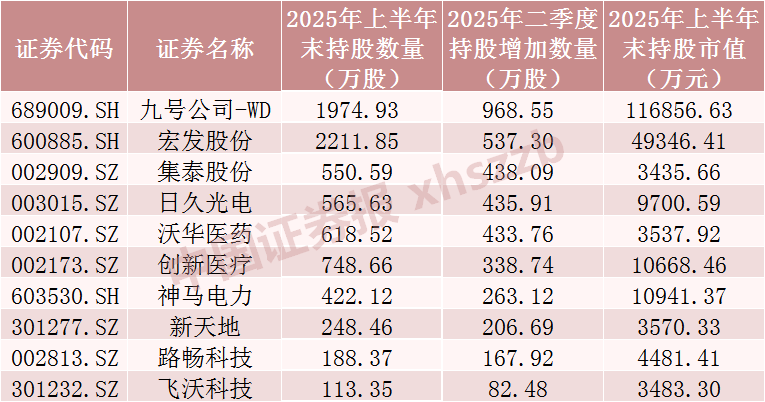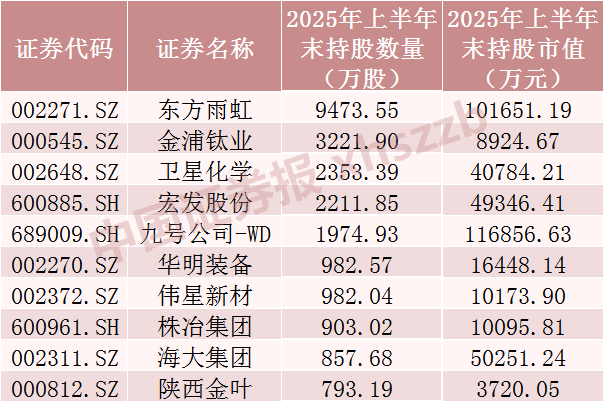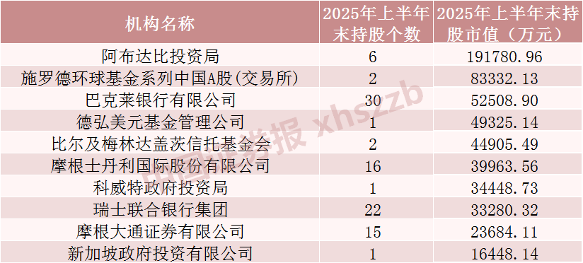近期,上市公司2025年半年报密集披露,上半年QFII重仓股及持股变动情况“浮出水面”。 数据显示,截至8月12日,已有264家上市公司披露了2025年半年报。其中,64家公司的前十大流通股东名单中出现了QFII的身影。QFII在二季度新进成为28只个股的前十大流通股东;同时,对另外18只个股的持股数量相比上季度有所增加。 行业方面,QFII对汽车行业持仓市值超过13亿元,对建筑材料、电力设备行业持仓市值均超10亿元。 持仓九号公司-WD超11亿元 数据显示,截至8月12日,已有264家A股上市公司披露了2025年半年报。在已披露半年报的上市公司中,有64家上市公司的前十大流通股东中出现了QFII的身影,合计持股数量3.65亿股,持股市值为63.99亿元(以2025年上半年末收盘价计算)。 从QFII持仓市值排名看,QFII对九号公司-WD的持仓市值达11.69亿元,位居第一;对东方雨虹、海大集团的持仓市值分居第二、第三位,分别达10.17亿元、5.03亿元。此外,QFII对宏发股份、卫星化学持仓市值均超4亿元。 已披露2025年中报上市公司中QFII十大重仓股 ![]() 在64只QFII持仓股中,QFII对28只个股在二季度新进前十大流通股东序列,其中,中宠股份、株冶集团前十大流通股东中QFII持仓市值均超过1亿元。 从持股增加数量情况看,数据显示,QFII二季度对18只股票持股数量增加。具体来看,持股数量增加最多的九号公司-WD获QFII加仓968.55万股;QFII对宏发股份、集泰股份持股数分别增加537.3万股、438.09万股。 已披露2025年中报上市公司中QFII持股数增加前十股 ![]() 持仓汽车行业市值最高 从行业板块持仓情况来看,在64只QFII持仓股中,QFII对汽车、建筑材料、电力设备行业持仓市值居前,分别为13.08亿元、11.18亿元、10.70亿元。 已披露2025年中报上市公司中QFII十大重仓行业 ![]() 从QFII相关机构持仓市值排名看,在64只QFII持仓股中,阿布达比投资局上半年末持仓市值最高,为19.18亿元;施罗德环球基金系列中国A股(交易所)、巴克莱银行有限公司持仓市值分居第二、第三位,持仓市值分别为8.33亿元、5.25亿元;德弘美元基金管理公司、比尔及梅林达盖茨信托基金会持仓市值均超过4亿元。 已披露2025年中报上市公司中持仓市值前十QFII机构 ![]() 从QFII持股数量看,QFII持股数量位居前三的个股分别为东方雨虹、金浦钛业、卫星化学,持股数量分别为9473.55万股、3221.90万股、2353.39万股。 已披露2025年中报上市公司中QFII持股数前十股 ![]()