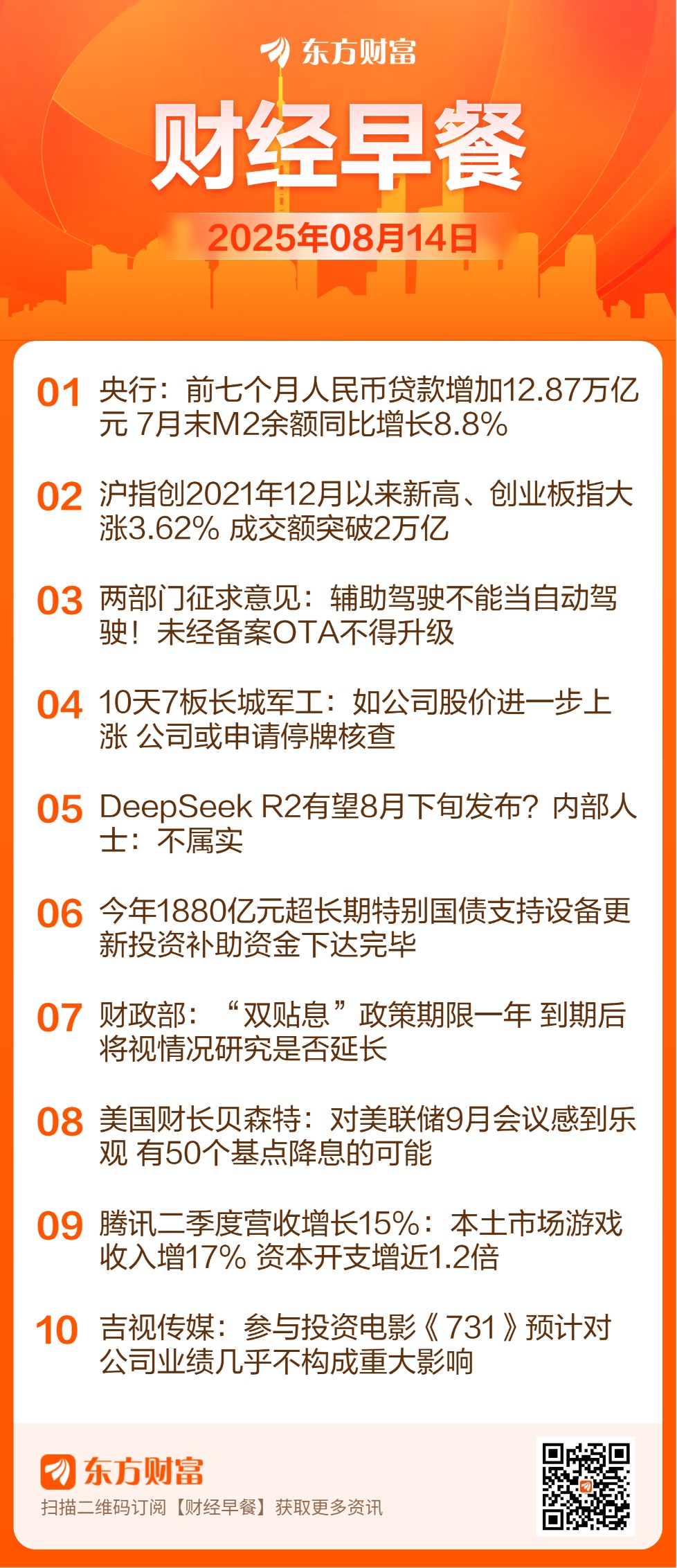 ![]() 每日精选金融数据: 中国人民银行公布7月金融数据。数据显示,2025年7月末,广义货币(M2)余额329.94万亿元,同比增长8.8%。狭义货币(M1)余额111.06万亿元,同比增长5.6%。前七个月净投放资金4651亿元。前七个月人民币贷款增加12.87万亿元,存款增加18.44万亿元。社融方面,2025年7月末社会融资规模存量为431.26万亿元,同比增长9%。 美联储: 美国财长贝森特表示,对美联储9月会议感到乐观,有50个基点降息的可能;可能会连续进行一系列降息操作;目前美联储的利率应该再下调150至175个基点。另外特朗普考虑让大卫·泽沃斯和里克·里德担任美联储主席。大卫泽沃斯目前担任杰富瑞的首席市场策略师,里克里德为贝莱德高级董事总经理,担任贝莱德全球固定收益首席投资官。 辅助驾驶: 市场监管总局会同工业和信息化部研究起草了关于加强智能网联新能源汽车产品召回、生产一致性监督管理与规范宣传的意见稿,意见表示辅助驾驶不能当自动驾驶,未经备案OTA不得升级,通知要求企业不得夸大组合驾驶辅助功能,避免误导消费者。市场监管总局将加大监督检查力度,对夸大宣传、欺骗或误导消费者等行为进行整治规范。 “双贴息”政策: 国务院新闻办公室13日上午10时举行新闻发布会,请财政部副部长廖岷和商务部、中国人民银行、金融监管总局有关负责人介绍个人消费贷款贴息政策和服务业经营主体贷款贴息政策有关情况,会上财政部表示“双贴息”政策期限一年,到期后将视情况研究是否延长。 设备更新: 近期,2025年超长期特别国债支持设备更新的1880亿元投资补助资金已下达完毕,支持工业、用能设备、能源电力、交通运输、物流、环境基础设施、教育、文旅、医疗、住宅老旧电梯、电子信息、设施农业、粮油加工、安全生产、回收循环利用等领域约8400个项目,带动总投资超过1万亿元。 社保基金: 截至8月12日,社保基金已经现身在41只A股的前十大流通股行列,合计持股市值达到126.22亿元。调仓方向来看,农商行、饲料、小家电等行业被增持力度较大,常熟银行是截至目前被社保基金持有市值最大的一只,也是二季度增持股数最多的;而电力、化学原料、医疗器械等则遭到减持,九州药业、杰瑞股份等持股数均出现明显的缩量。 反制欧盟: 欧盟在第18轮对俄罗斯制裁中将两家中国金融机构列入制裁名单,严重违反国际法和国际关系基本准则,严重损害中国企业合法权益。,经国家反外国制裁工作协调机制批准,中方决定将欧盟UAB Urbo Bankas和AB Mano Bankas两家银行列入反制清单,并采取以下反制措施:禁止我国境内的组织、个人与其进行有关交易、合作等活动。 热点题材辅助驾驶: 市场监管总局会同工业和信息化部研究起草了关于加强智能网联新能源汽车产品召回、生产一致性监督管理与规范宣传的意见稿,意见表示辅助驾驶不能当自动驾驶,未经备案OTA不得升级,通知要求企业不得夸大组合驾驶辅助功能,避免误导消费者。市场监管总局将加大监督检查力度,对夸大宣传、欺骗或误导消费者等行为进行整治规范。 生育补贴: 湖北一地生二孩最高奖补28.71万 生三孩最高奖补35.59万。根据记者从湖北省天门天门市卫生健康委员会获悉的政策,当地二孩家庭累计最高可享受价值约287188元的奖励、补贴及免费服务,三孩家庭累计最高可享受价值约355988元的奖励、补贴及免费服务。 具身智能: 在刚刚落下帷幕的2025世界机器人大会,英伟达携手众多中国机器人生态合作伙伴亮相,展示了其在物理AI与通用机器人领域的战略布局,宇树科技和银河通用位列其中。英伟达的机器人生态并非简单采购关系,而是以基础设施,把分散的硬件本体、垂直场景、算法团队编织成一张可快速商业落地的网络。 脑机接口: OpenAI被曝计划以约8.5亿美元估值投资新的脑机接口初创公司Merge Labs,但谈判仍处于早期阶段。此举也意味着OpenAI公司CEO奥尔特曼(SamAltman)将向马斯克发起新的挑战。目前马斯克旗下的脑机接口公司Neuralink已经进入到临床试验阶段,并已经植入7例患者,该公司估值也已达到近百亿美元。 创新药: 国家医保局12日对2025年国家医保药品目录初步形式审查结果进行公示,534个药品通过形式审查,较2024年明显增加。首次设立的商保创新药目录共121个药品通过审查。有券商指出,在医保基础上补充发展商保,有利于具有创新性和临床价值的高价创新药落地。 商业航天: 8月4日,我国在海南商业航天发射场使用长征十二号运载火箭,成功将卫星互联网低轨07组卫星发射升空。此前,我国分别在7月27日、7月30日发射两组卫星。此外,8月4日星网完成第七发组网星发射,距第六/五次发射仅间隔5/8天,发射频率大幅提速。垣信卫星最新招标7次火箭发射服务,总金额13.36亿元,交付周期至2026年3月。 折叠屏: 据悉,苹果将在2026年下半年将率先推出iPhone 18 Pro和iPhone 18 Fold,其中iPhone18 Fold可能为折叠屏,而较低端型号或将延期至2027年春季发布。摩根大通认为,苹果将为折叠屏定价1999美元,约合14343元人民币。 公司新闻长城军工:截至2025年8月13日收盘,公司股票连续10个交易日内(2025年7月31日至8月13日)收盘价格涨幅偏离值累计超过100%,根据《上海证券交易所交易规则》有关规定,属于股票交易严重异常波动情况。公司基本面未发生重大变化,但近期公司股票价格脱离公司基本面,投资者参与交易可能面临较大风