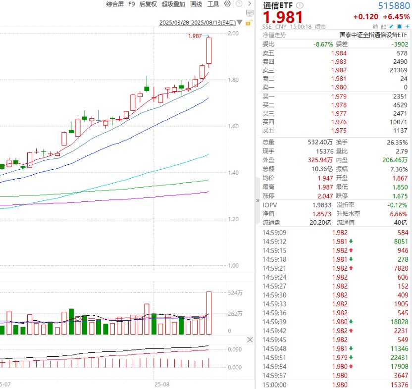 每经编辑|叶峰 8月13日,通信ETF(515880)单日涨幅达6.45%,光模块标的拉动明显,通信ETF标的指数中光模块占比超40%。创业板人工智能ETF(159388)涨幅达5.50%。基本面角度,受益于AI算力需求的爆发式 ...