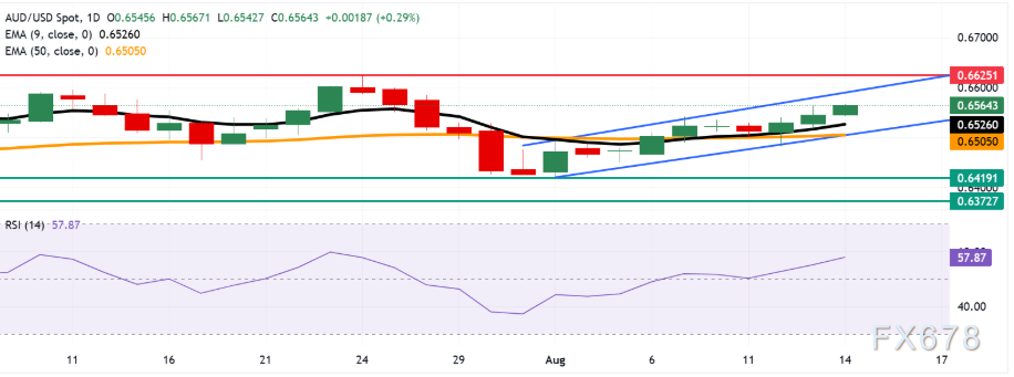周四 8月14日 亚洲时段 在国内劳动力市场数据公布后 澳元一度延续过去两个交易日涨势 最高触及0 6568 涨幅约0 37 目前回落至0 6549附近 随着美联储进一步降息的可能性上升 美元贬值 澳元兑美元货币对也获得了支撑 ...