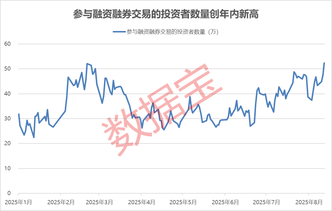证券时报·数据宝统计显示,8月13日参与融资融券交易的投资者数量为52.34万名,创年内新高,超过了2月21日的52.14万名。与上一交易日相比,投资者数量增加4.61万名,环比增长9.67%。 截至8月13日,融资融券个 ...
