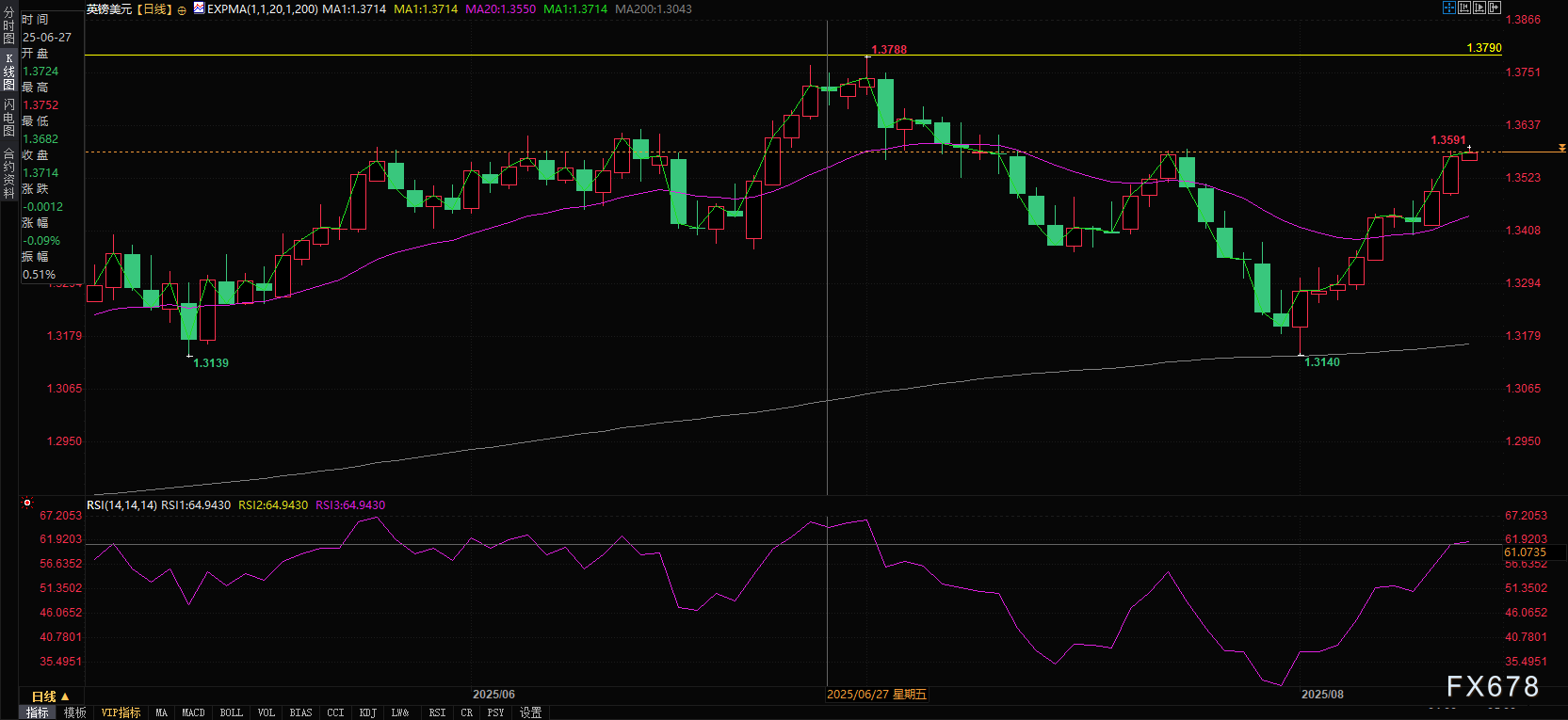 ![]() 工业数据同样表现强劲:6月制造业产出与工业生产环比分别增长0.5%和0.7%,较5月显著下滑态势实现反弹。 乐观的GDP与工业数据表明,英国经济表现优于预期——这一态势或使英国央行(BoE)无需激进降息,从而为英镑提供支撑。 在本月初的货币政策会议上,英国央行(BoE)将利率下调25个基点至4.00%,并维持“渐进审慎”的货币宽松政策指引。但此次决策分歧显著——九位货币政策委员中,有四人投票主张维持利率不变。 每日摘要市场动态:英镑兑美元再创月度新高 英镑兑美元周四欧市盘中跳涨至1.3600附近——英国GDP数据公布后,市场对英国央行维持鹰派立场的预期升温。 美元持续承压,因交易员普遍预期美联储将在9月货币政策会议上降息。追踪美元兑六大货币走势的美元指数(DXY)脆弱徘徊于97.85附近的两周低点。 CME美联储观察工具显示,市场已完全定价9月降息25个基点的预期,届时联邦基金利率将降至4.00-4.25%区间。 美联储降息预期强化主要源于:①劳动力市场降温 ②最新CPI报告显示关税对通胀影响有限。 本月早前公布的美国非农就业报告显示,7月新增就业岗位低于预期,且5-6月数据遭大幅下修。而周二CPI报告表明,整体通胀月率如预期增长0.2%(前值0.3%),且未显现关税显著推高物价的证据。 美国财长斯科特·贝森特周三接受彭博电视专访时,以劳动力市场担忧为由呼吁美联储采取激进宽松政策。他预测将迎来“系列降息”,并主张9月会议应大幅降息50个基点,称“现行利率限制过度,应下调150-175个基点”。 日内市场焦点转向北京时间20:30公布的美国7月PPI数据。市场预期:月率方面,整体与核心PPI均料增长0.2%(6月为零增长);年率方面,整体与核心PPI预计分别加速至2.5%和2.9%。 技术分析:英镑上涨至1.3600附近 ![]() 英镑兑美元汇率周四升至1.3600附近,创下一个月新高。由于汇价坚守在20日指数移动平均线(EMA)1.3445上方,英镑兑美元短期趋势仍维持看涨。 14日相对强弱指数(RSI)突破60关口。若该指标能持稳于此水平上方,或将触发新一轮上涨动能。 下行方面,8月11日低点1.3400构成关键支撑区域;而上行方向,7月1日高点1.3790附近将形成重要阻力位。 北京时间17:10,英镑兑美元交投于1.3582。 ![]() |
