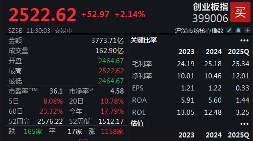 每经记者|刘明涛 每经编辑|叶峰 8月15日,A股低开高走,创业板指涨逾2%,截至上午收盘,上证指数涨0.47%报3683.58点,深证成指涨1.19%,创业板指涨2.14%,北证50涨2.74%,科创50涨0.52%,中证A5 ...