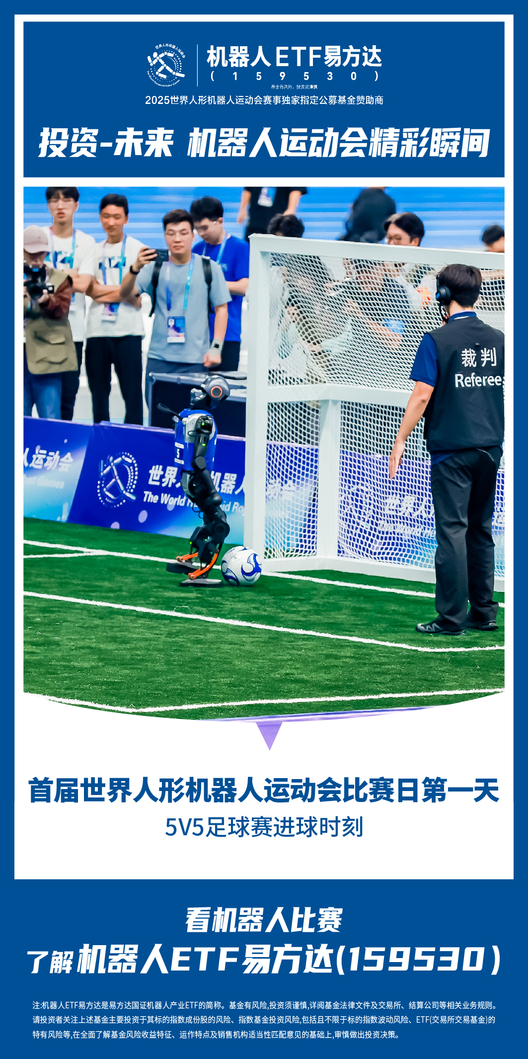 近期机器人板块反复活跃,相关产品持续受到资金青睐,Wind数据显示,机器人ETF易方达(159530)连续9个交易日获净流入,最新规模达47.5亿元,创成立以来新高。 2025世界人形机器人运动会正在北京“冰丝带”国际速滑馆火热举行,今日为大赛首日,田径、足球、群体舞蹈、武术等项目成关注焦点,其中足球项目将分别展开3V3和5V5竞技,多支机器人队伍在小组赛中激烈对决,角逐下一阶段赛事的门票。 据了解,作为这场科技盛会的唯一公募基金官方赞助商,机器人ETF易方达(159530)将深度融入赛事,为这场前所未有的竞技盛宴注入金融动能。 该ETF跟踪的国证机器人产业指数中,人形机器人相关个股占比近八成,“人形含量”在ETF跟踪的指数中居首,更加贴合人形机器人产业链。机器人ETF易方达(159530)规模在同标的指数ETF中居第一,可助力投资者精准布局人形机器人未来发展机遇。 |