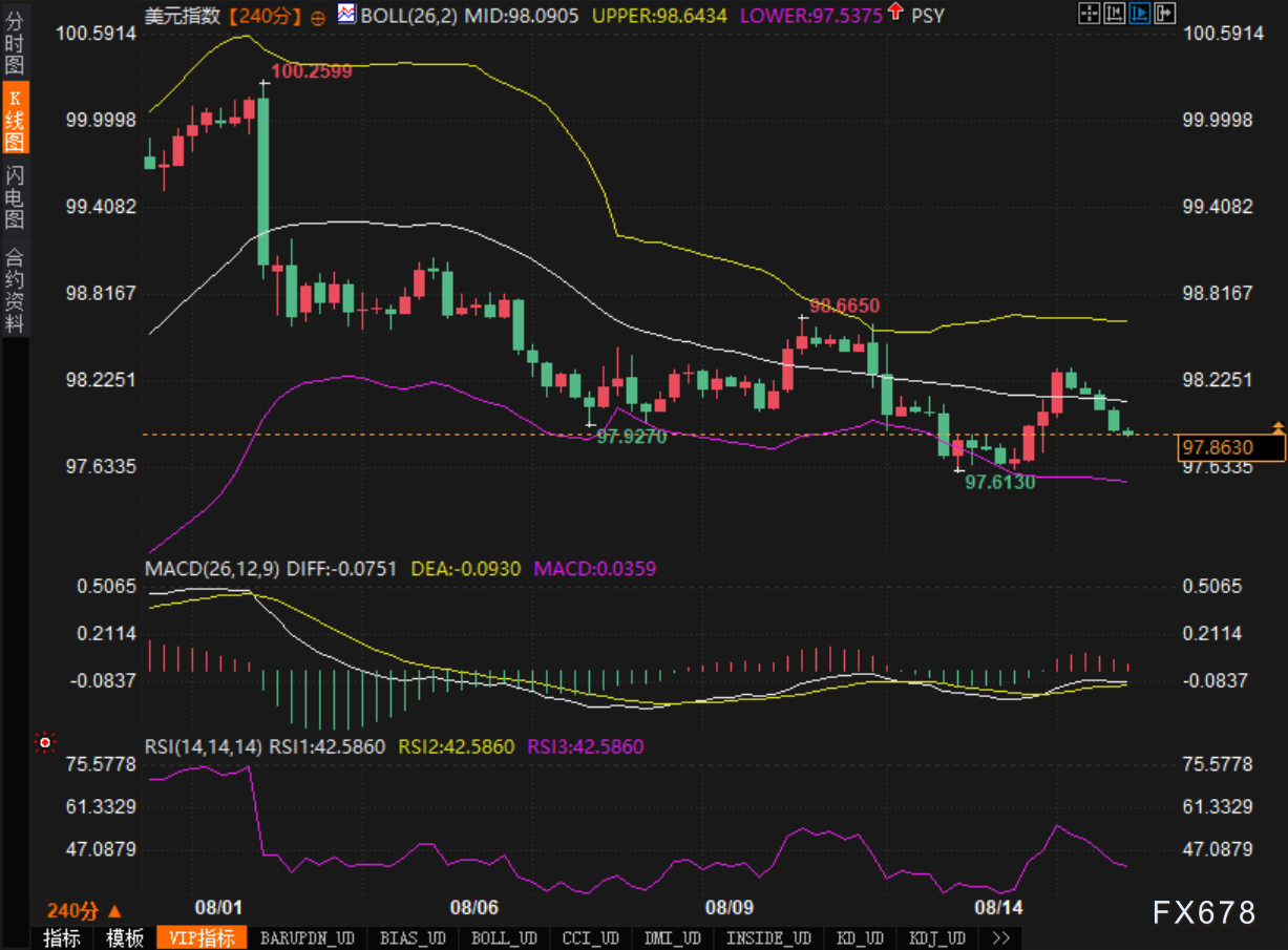 周五(8月15日),美元指数(DXY)继续在下降通道内震荡运行。周四美国生产者物价指数(PPI)强于预期,推动美元短期反弹,但很快就遭遇顶部压制,最高触及98.32,并在周五回吐几乎所有涨幅,重新回到98.00以下。市场 ...