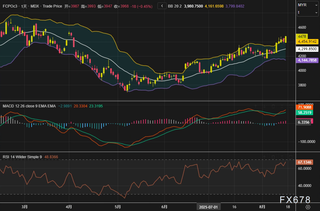 周五 8月15日 马来西亚衍生品交易所 BMD 棕榈油主力合约FCPOc3收报4478林吉特 吨 单日涨幅1 7 周线累计攀升5 24 创下近两个月最大单周涨幅 技术面上 价格突破布林带中轨 4161林吉特 但MACD柱状图仍处 ...