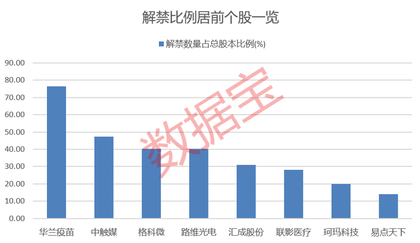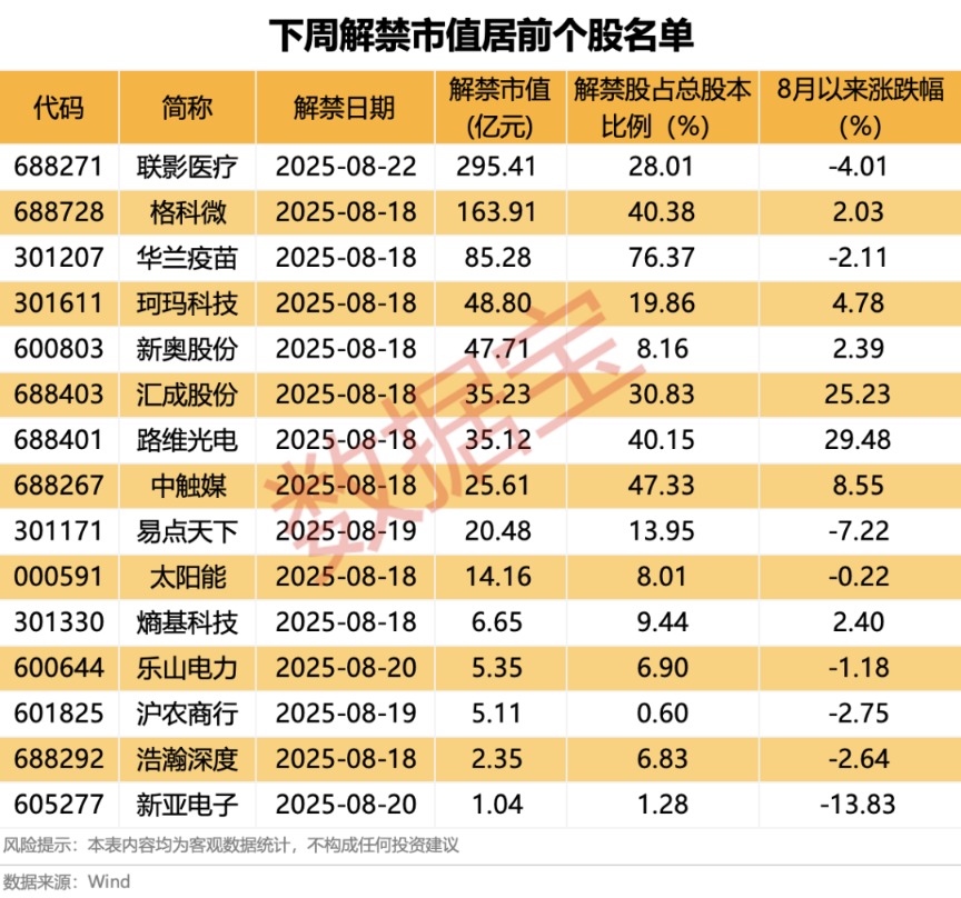 下一周A股解禁市值总额达795.29亿元。 下周25股面临解禁 据证券时报·数据宝统计,下周将有25股面临解禁(已发布解除或流通公告),按照最新收盘价计算,合计解禁市值795.29亿元。 联影医疗下周将有2.31亿股上市流通,主要为首发原股东限售股份,解禁市值达295.41亿元。 格科微的解禁规模次之,下周将有10.5亿股上市流通,主要为首发原股东限售股份,解禁市值达163.91亿元。 相比之下,兰剑智能、五新隧装、高新发展、泰和新材等10股的解禁压力较小,解禁市值均不足亿元。 从解禁比例来看,华兰疫苗的解禁比例居首,达76.37%;中触媒、格科微、路维光电、汇成股份等解禁比例也居前。 ![]() 2只解禁股近期获得机构调研 据数据宝统计,下周将要解禁的这25股,8月以来平均上涨3.93%。 路维光电月内上涨幅度居首,累计上涨29.48%;下周该股将有0.78亿股面临解禁,解禁市值35.12亿元。汇成股份股价涨幅次之,月内累计上涨25.23%。 股价下跌的个股中,五新隧装、联影医疗、易点天下、新亚电子的跌幅居前;其中新亚电子的跌幅最大,8月以来累计下跌13.83%。 下周解禁股中,新坐标、乐山电力近日获得机构调研。 新坐标表示,公司成功开发了无酸洗除锈、环保无渣磷化等专利技术;自主开发集成的生产线,实现了线材除锈、磷化、皂化、拉拔的连续生产,提高了生产效率;创新研制的液体喷砂机,开创了线材表面无酸洗除磷新工艺。公司的新技术,突破了冷镦线材的精制质量不稳定、易受环保措施影响而停产或限产等行业痛点。 乐山电力在近日的机构调研活动中表示,乐山电力龙泉驿区100MW/200MWh电化学储能电站已于2025年7月14日成功并网投运,试验数据经审核合格后正式转入商业运行,转入商业运行需3个月左右时间。项目投运对公司2025年度经营业绩的影响暂时不能准确测算,最终影响金额以公司2025年度经审计的年度财务报告为准。 一般而言,解禁的利空影响对于业绩亏损或下滑的个股要显著大于绩优股。 下周面临解禁的个股中,3股发布了上半年业绩预告或快报。泰和新材业绩预减,公司预测净利润约2500万元~3500万元,较去年同期变化约为-78.72%~-70.21%。2025年上半年,先进纺织业务方面,受行业低迷影响,产品售价持续低位波动,公司通过降本增效、优化销售结构、加强客户开发,业绩同比略有改善。安防、信息与新能源业务方面,受行业竞争加剧和终端需求乏力等因素影响,公司部分品类产品售价同比出现下滑,该业务的盈利能力较去年同期出现一定幅度的下降。 珂玛科技上半年业绩预增。乐山电力披露的2025年半年报业绩快报显示,公司上半年营业总收入16.23亿元,同比增长1.94%;净利润790.31万元,同比下降14.55%。 ![]()